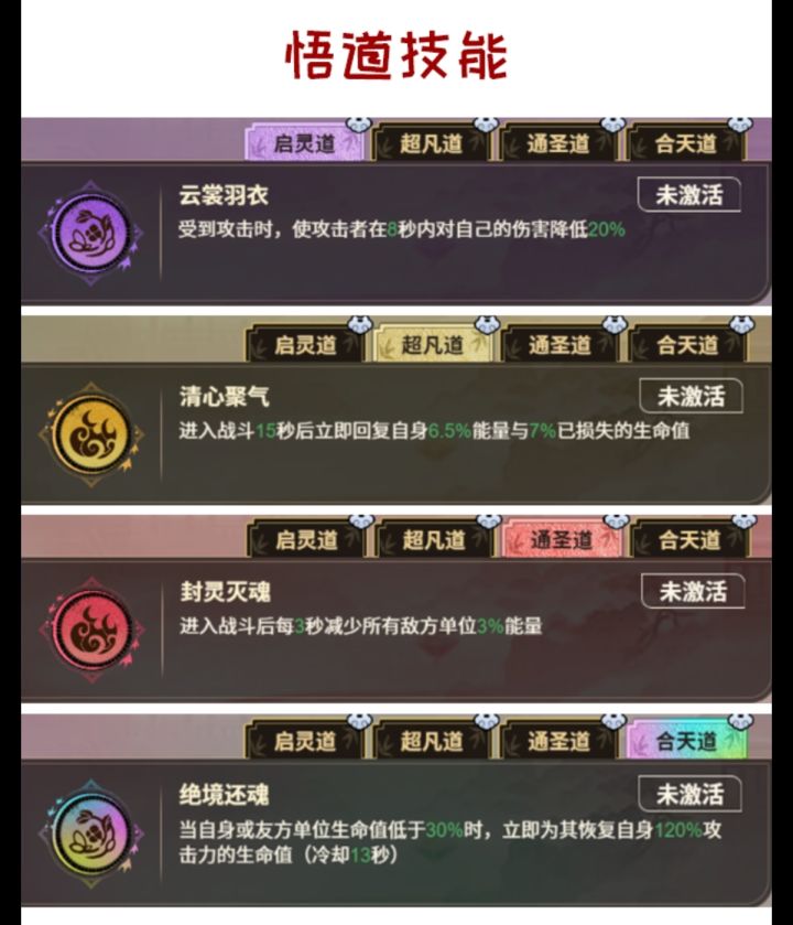 灵台清明:血量首次低于 15% 时,立即回复自身 6.5% 能量,并在 7 秒内免疫大部分负面与控制效果,在残血时能恢复状态并保持作战能力。