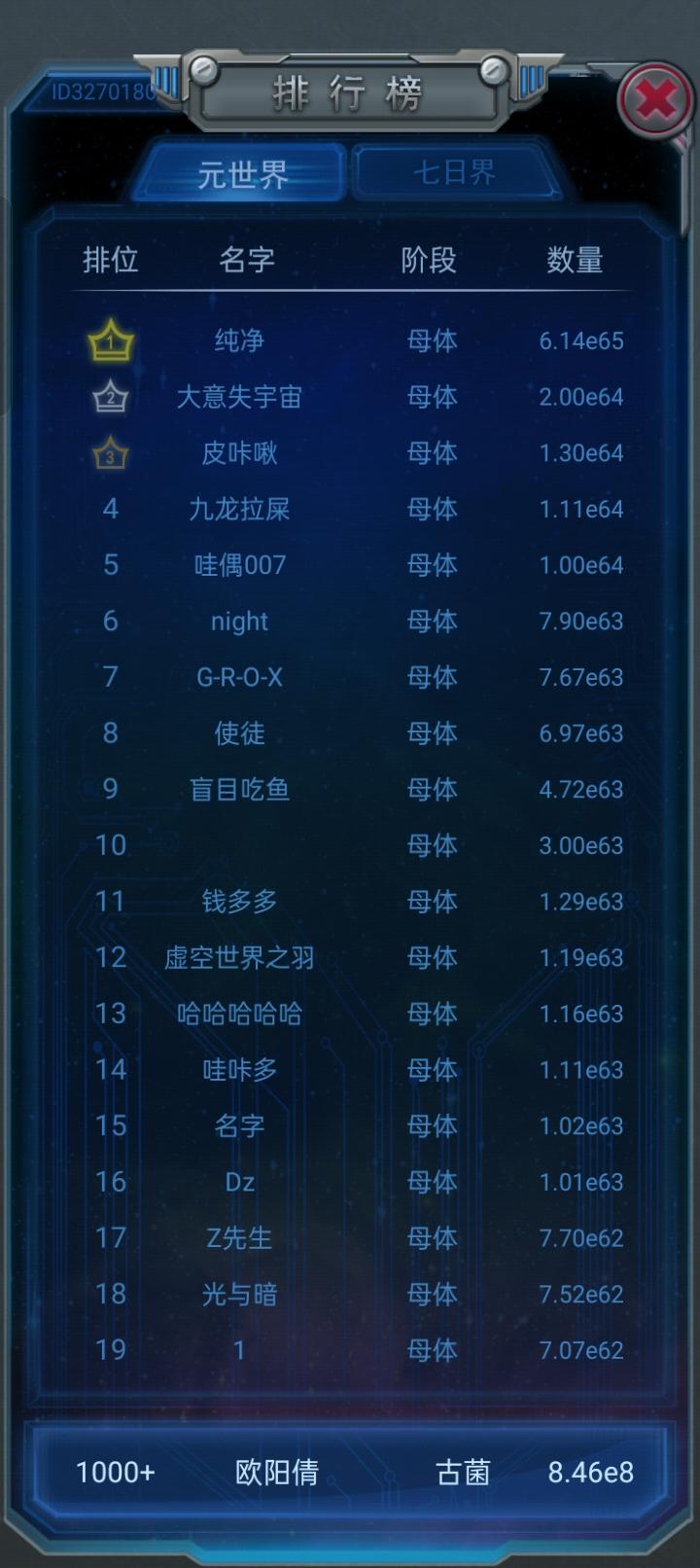 昨天发了日记,有个大佬给我个提醒说点一下尘埃,因为我之前玩的从细胞到奇点,下意识以为最高收益最好,没注意到他这个不一样,升级后也没去拉等级,看到回复后我就去拉了一下等级果然尘埃变多了也不会那么缺雷电,本来今天不打算解锁物种的,可惜不小心点到了,没办法再加上对古菌的生产也没影响,现在一秒能加两万古菌了,而且每秒能加一点古菌。老实说我估计浪费了一天时间,可惜了,不过我也不追求速度也就慢慢来吧,有没有大佬知道暗能量咋弄啊,现在还没有一点,听大佬们说的暗能量多少一炸的,到现在还没一点,而且排行榜也还没上,慢慢来吧嘿嘿