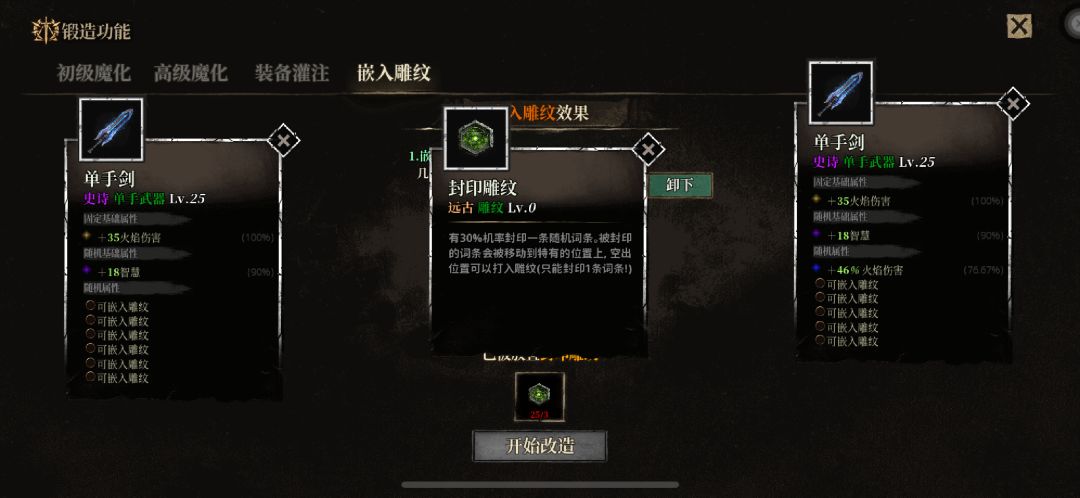 接下来就是胚子的选择,固定基础和随机基础适配是胚子选择的关键,例如我们是火球,以武器为例,固定基础要选火焰伤害,随机基础要选对火球有提升的属性。胚子选择好,我们把他原有的随机属性全部剥离,砸上我们从其他装备上剥离出来的好词条即可。这里强调一点,可以反复剥离,砸,刷高属性。