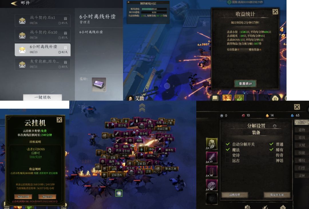 挑一些好装备一穿,我们就可以在4层打一个好数据,这时候就可以领了邮箱里的6小时离线福利了,领完直升25级左右,外加满屏大爆。在这之前,可以把分解设置勾一下,只留下高阶装。因为我没有首充武器和项链,效率低一些,如果首充了,可以高速到达25级,解锁英雄的第二特征。