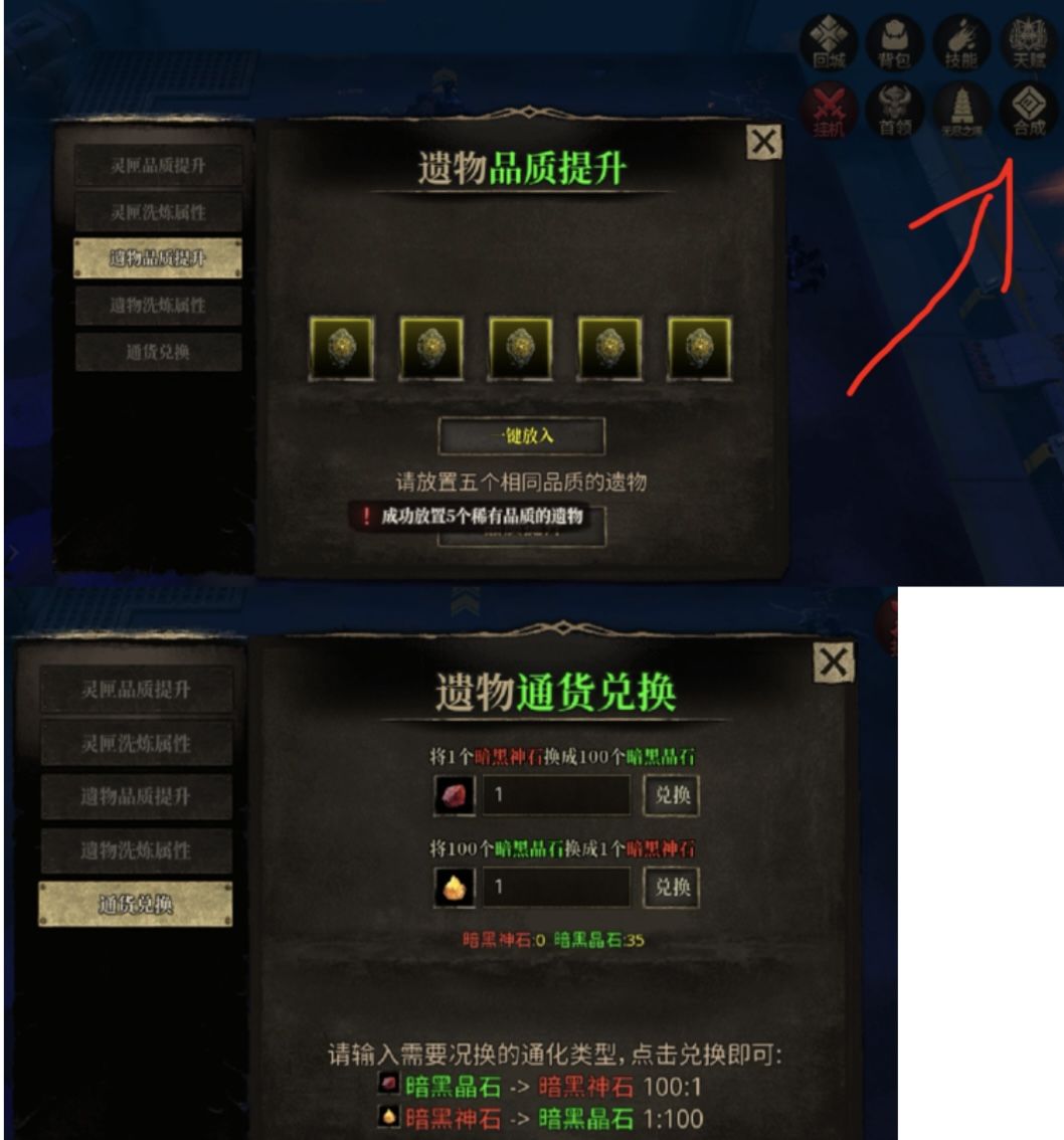 遗物和盒子都可以5合1进行升阶,晶石和神石也可以互换。