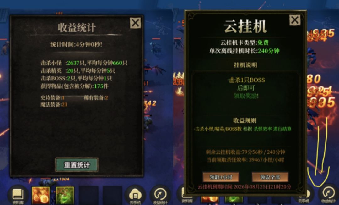 收益统计是打完x关一轮杀掉最终boss的统计数,云挂机离线时长和这个统计挂钩,关卡越高,统计数据越好,挂机收益就会越好,打完boss后,领取全部就可以拿到离线收益。礼包送了一些离线时长,我们随便整点装备三层打一轮,大概600+小怪的效率,可以领一波离线,直升到18级左右,外加一些装备。(氪佬可以拉高)