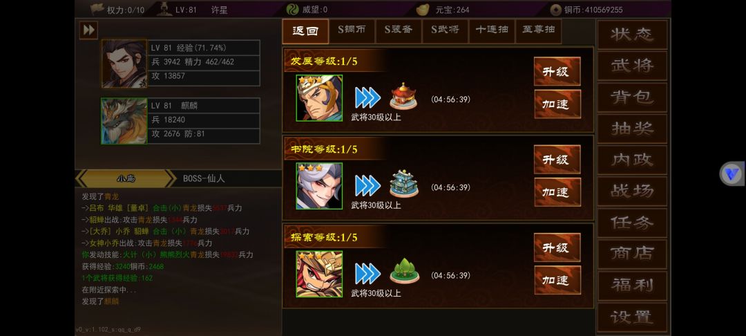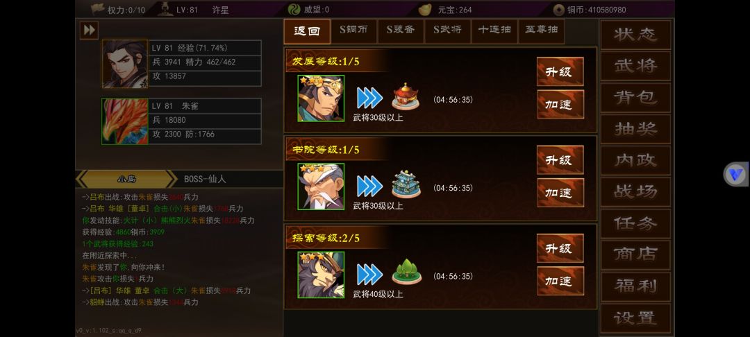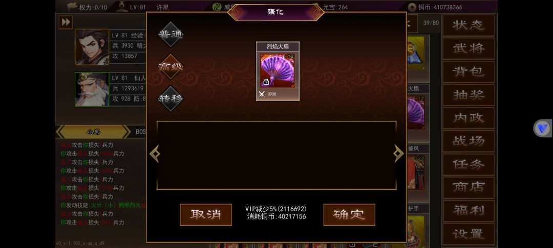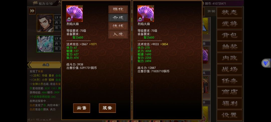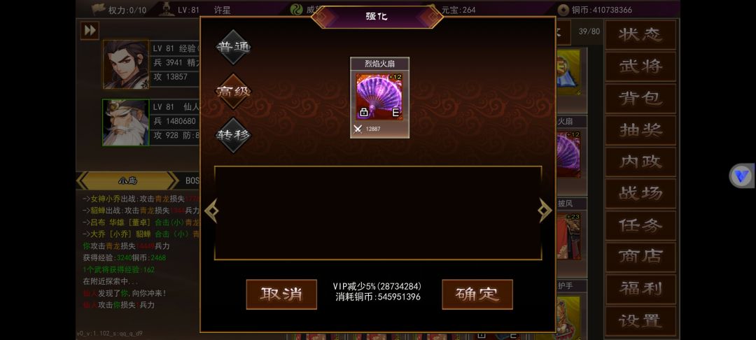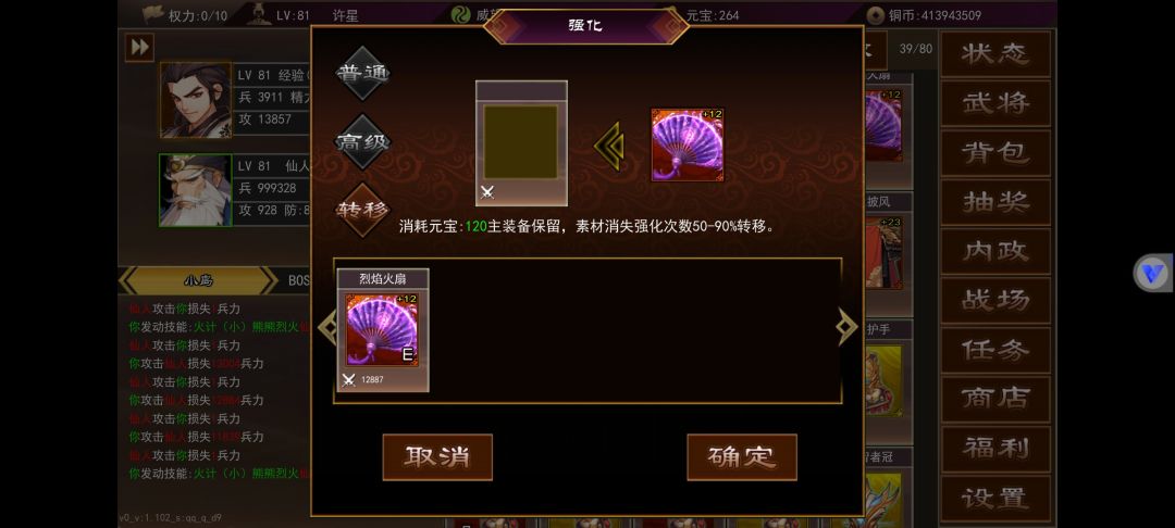 武将内政在角色50级还是55级开启来着,不记得了不过到等级就会开启第一个城,里面一共有3个可以内政的,上面图里有详情。内政等级不要升级,不要升级,不要升级,重要的事情说三遍,升级后原本只需要30级的武将就要40级的,对于平民玩家来说太难了,内政一般用平时抽装备的时候抽出来的3星武将,升满级30级刚好内政,内政影响最大的就是魅力值,一般做出75级武器就有2000+的魅力,不过这得看脸,附加的各项属性是随机的,魅力够高什么好东西都能出,我现在3000魅力时不时能出兵法卡和元宝卡,还有高级坐骑。再来就是武器强化,武器强化最高上限是+99。75级武器普通强化花费消耗比较高,花费在1.5亿-2.5亿之间浮动,购买十个黄装合成就要花费1亿铜币上下,强化花费根据你的武器数值决定。另一种就是权利强化,权利是根据VIP等级决定,VIP经验又可以白漂,每月的兑换码,活动的元宝兑换都能获得VIP经验,一般做完最近的活动能达到8-10权利,75级权利强化一次消耗3点权利,我每天也只能强化三次,权利强化根据你的武器强度而决定强化消耗的铜币,我的9000+攻,附加属性较高的75级武器权利强化一次5.4亿,另一把3000+攻,附加属性较低的武器权利强化一次只需要四千万。所以必要做一把或者比较欧可以去普通20元宝抽奖抽一把低级红色装备用权利强化,这样消耗很低。怎么把低属性武器的强化弄到自己做的高级武器呢,这时候就要说到转移这个功能,转移是把相同等级相同武器的强化次数转移到另一个武器上面,转移消耗元宝,一强化等于十元宝,一把加一百的武器转移需要花费1000元宝,转移强化次数在50%-90%之间,这个看脸,虽然转移消耗比较高,但是变强速度很快,就拿我这把低级武器来说,一个月左右就能+90,消耗36亿,如果是另一把9000攻的武器,同样+90需要540亿+,我每天就2-3亿铜币,是一点都强化不起,虽然转移消耗元宝比较高,但是能快速提升自己,攻击高了,打怪效率就高了,这样铜币就能丰富起来了,慢慢的就能正循环起来。