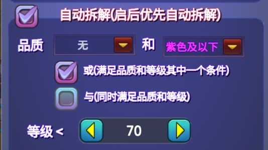 然后看拆解设置,品质左侧是下限,右侧是上限,是包含本品质的,比如我要保留橙色及以上装备,那上限就设置紫色及以下,下限可以是无或者白色及以上。等级是小于多少级,不包含本数,这里小于70级会拆解65及以下的(没用的冷知识,等级左右按钮是整5、整10的等级,而点框可以输入其他等级)。品质和等级是两个条件,勾选“或”是满足任一条件就执行拆解,勾选“和”是同时满足这两个条件才会执行拆解。(等级这个用处其实不是很大,因为你获取的装备等级不会有很大浮动,感觉如果后续加上下限,这样可以执行当前等级的装备拆解,低等级装备卖出的操作)