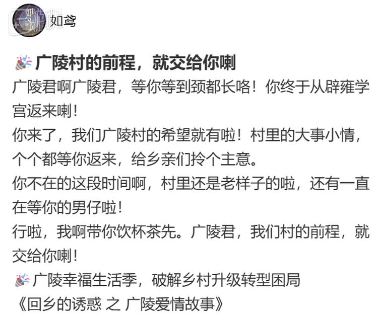 先是《光与夜之恋》在游戏内实装了“丰果农场”系统,紧接着不久《恋与制作人》放出七夕“建设四季农场”主题返场,而《如鸢》那边的情况也不简单,直接将活动命名为“回乡的诱惑之广陵爱情故事”。