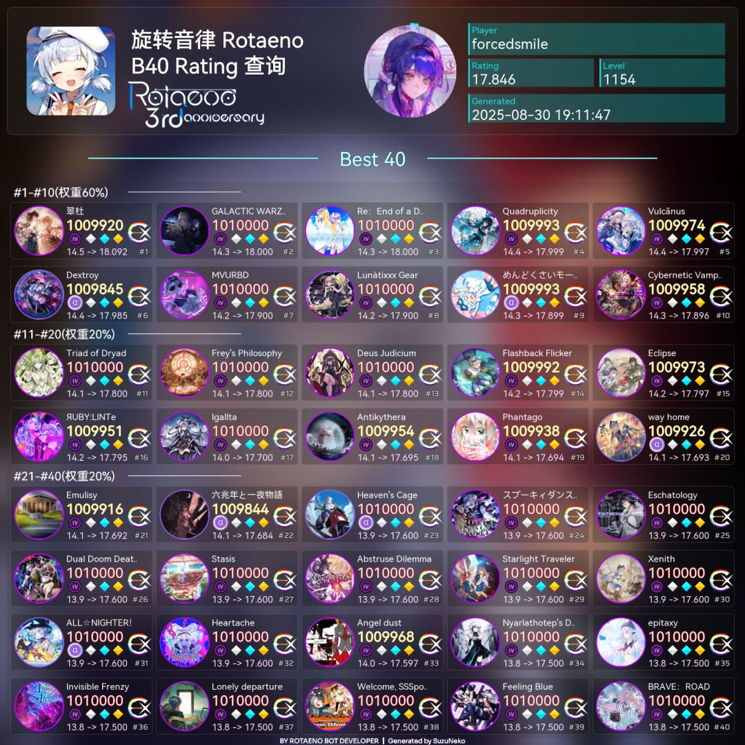 这个暑假咱也是当了一回飞升龙币啊,从暑假开始的17.788一直飞到了现在的17.846,理论了近130首歌曲,其中有6首14,同时也刷新了自己的rtn最高成就(终梦理论),说句实话,其实刚开始的时候我是不相信我自己能飞这么多的,但看到自己一首又一首的理了以前根本打不动的14之后,才发现自己原来也得到了成长,现在主包已经进入了高中的学习,所以接下来这三年推分的时间会比以前少很多很多,可能也只会在更新的时候上线打一下,其余的时间基本都不会再推分了,但想要飞升就又要很长一段时间的铺垫,所以下一次的飞升期估计是要在很久以后了,虽然以后不会像现在这样飞升的这么快了,但我仍会坚持在rtn道路上的探索,以及进步,并争取早日攀登上全曲理论的高峰,谢谢![[表情_比心]](https://img.tapimg.com/market/images/a272560c8c816575cd8af72d0df6bbf1.png)