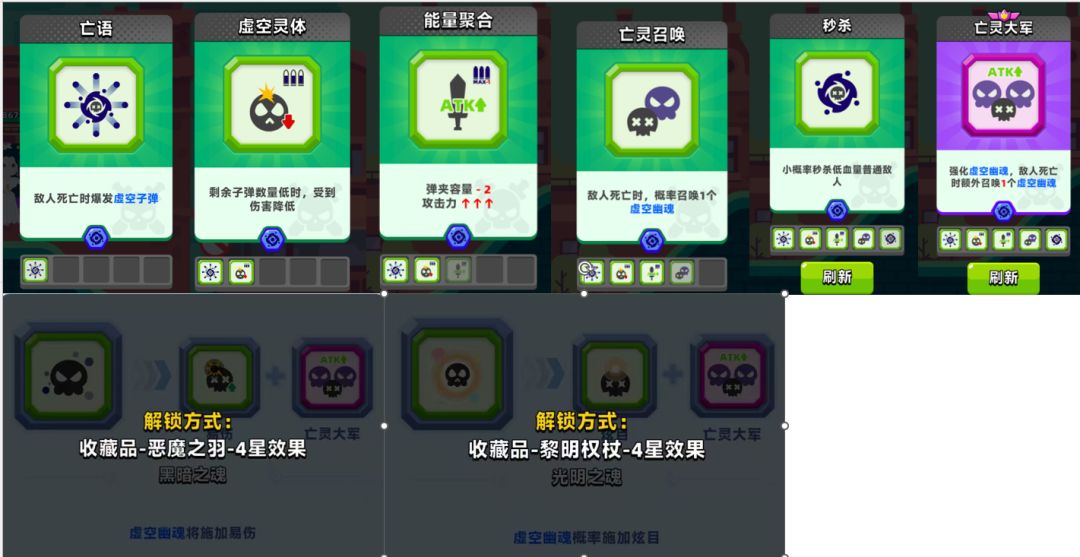6亡灵大军:强化虚空幽魂,敌人死亡时额外召唤1个虚空幽魂(解锁收藏品-恶魔之羽-4星效果组成combo黑暗之魂:虚空幽魂将施加易伤) (解锁收藏品-黎明权杖-4星效果组成combo光明之魂:虚空幽魂概率施加炫目)