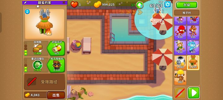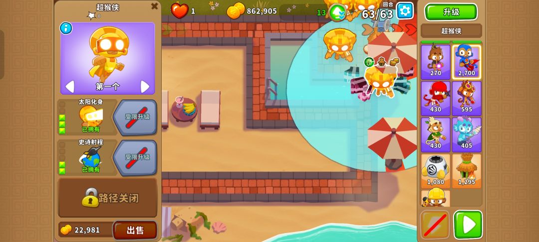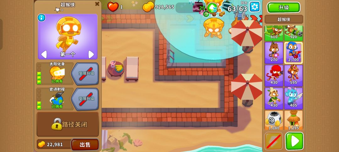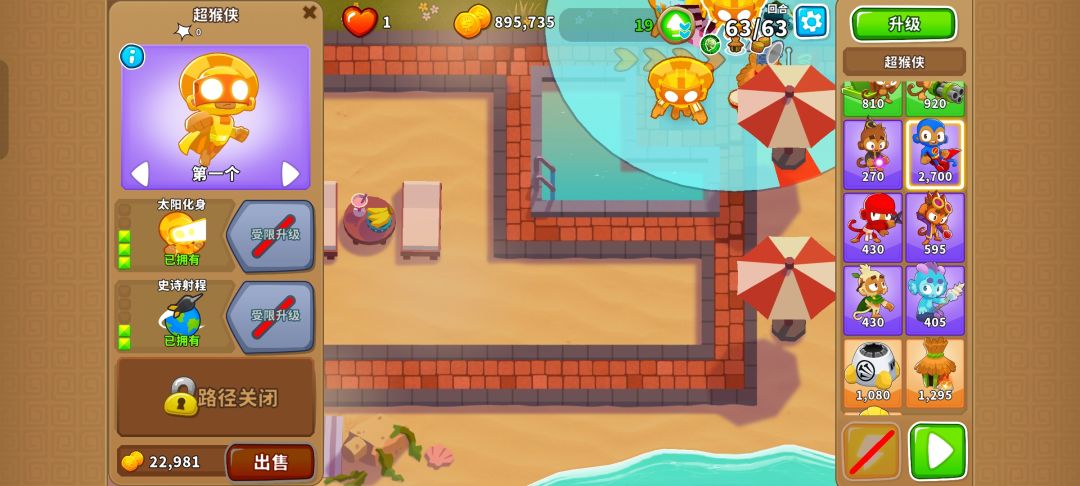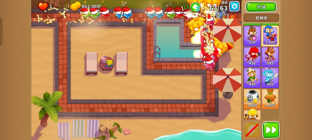 先在右上角雨伞的左上角侧贴近路线的地方放下220猴子村,然后在范围内放下4个320超猴侠,其中一个需要放在小方框内,就能有惊无险地通过!只需29阶哦!