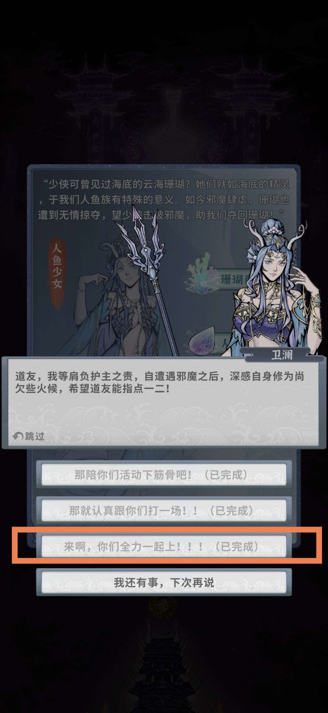 第三个可能会卡的地方就是过师尊后的副本,万劫台的守门员龙女(她就是漩涡门口的龙女),在这里可能还会被她毒打一次,我们用老办法过就行了