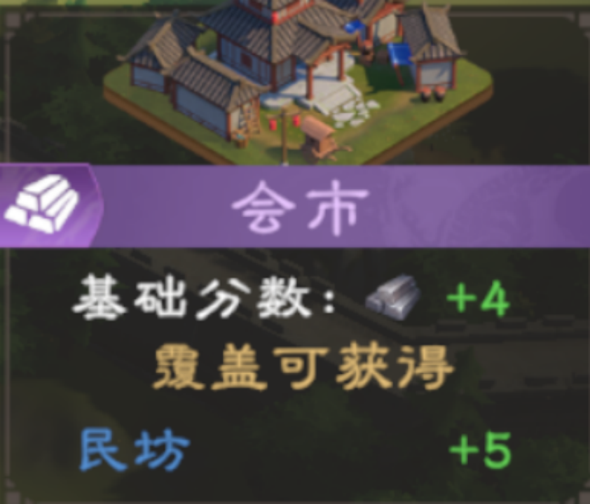 五级建筑为会市,所有四级建筑覆盖它时将会加分,同时,其覆盖民坊时,也会加分。