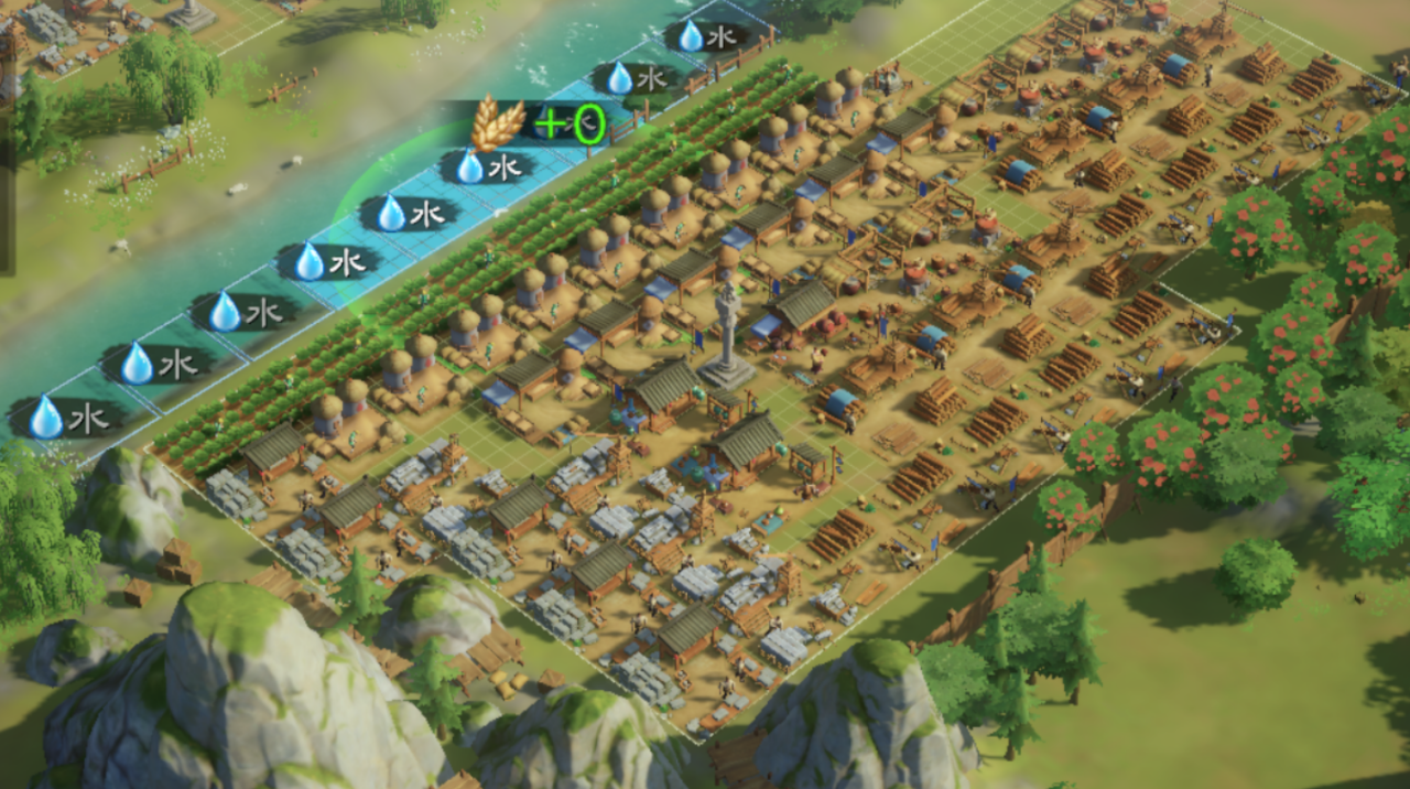 该封地左下为水,布置田庄,上方和右边都是树,布置大量伐木场。再依次向内布置对应的各级建筑即可。