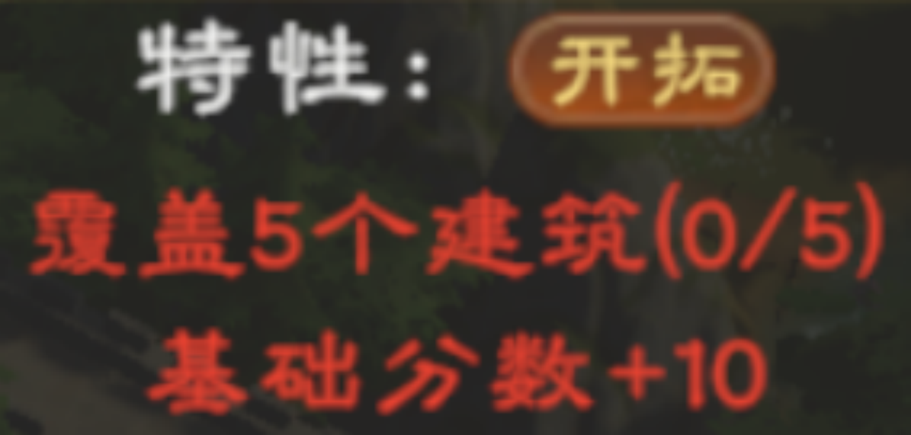 独特特性,覆盖超过5个加分建筑积分+10,条件要求比自强高,但是加分一样,有自强的话,还是选择自强为好。
