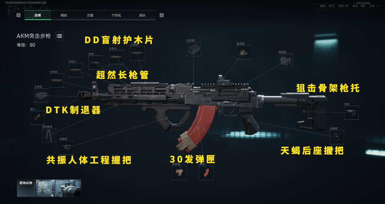 这样一番操作下来AKM相对于默认来说,在后坐力、据枪稳定性和操控速度这三个方面都有一定程度的提升。并且开镜速度能保持在216ms,跑射延迟也能维持在82ms。这两个数据足够AKM在近距离绞肉了,同时也给换装大弹夹、弹鼓留下了空间。