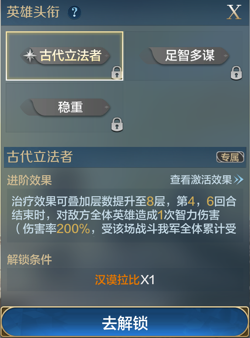进阶效果:治疗效果可叠加层数提升至8层,第4、6回合结束时,对敌方全体英雄造成1次智力伤害(伤害率200%,受该场战斗我军全体累计受到的伤害值影响)。