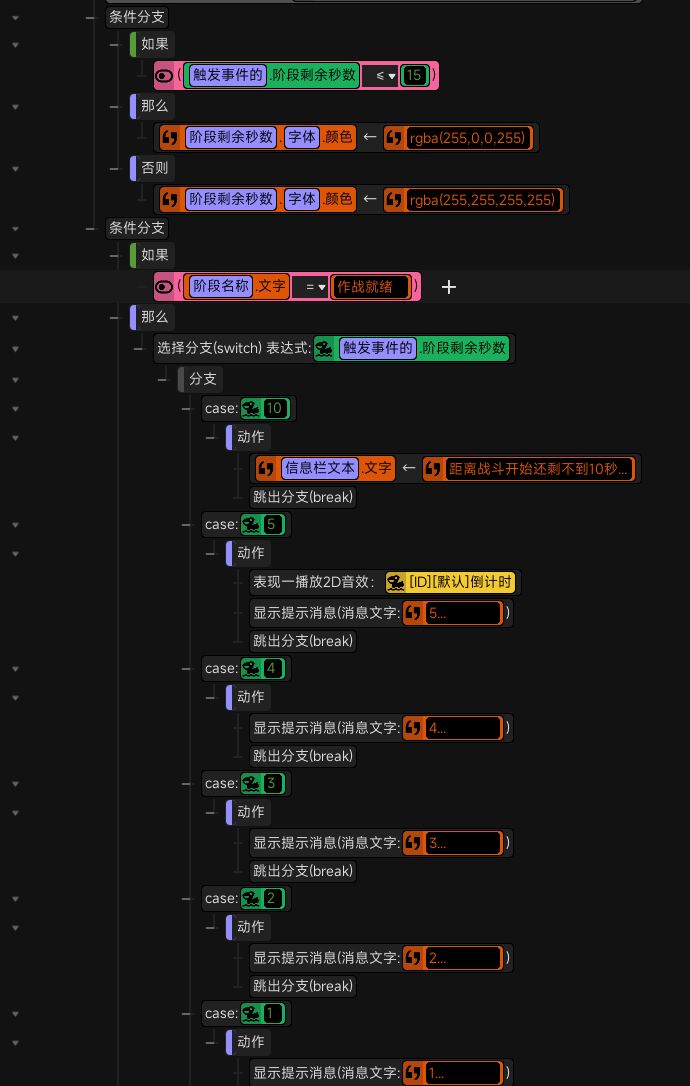 在服务端新建一个阶段结束的触发器,使其在收到当前阶段结束事件时触发。局部变量中声明当前阶段,通过当前阶段的名称获取所在阶段,并以此作为选择分支表达式进行阶段判断。最简单的是当选择首领阶段结束时,提前加载战斗场景并直接开始下一阶段即可(P2)