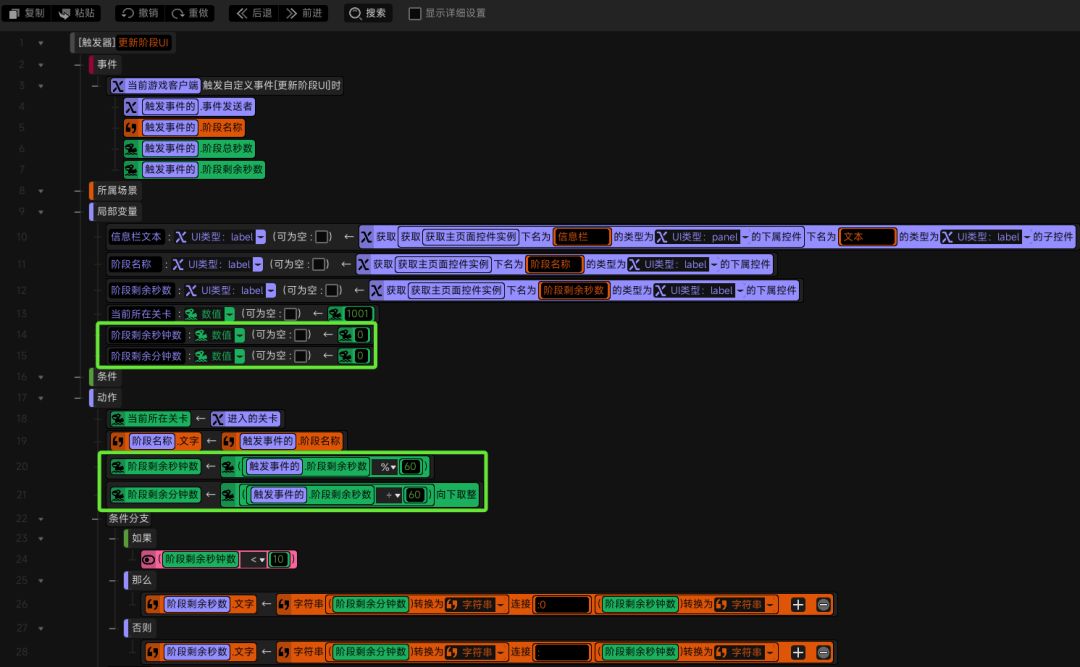 来到客户端,这个触发器的一个重点是将剩余秒数正确转换成显示的分秒数。将阶段剩余秒数除以60取余为显示的秒钟数,而将阶段剩余秒数除以60并向下取整得到显示的分钟数;这里还要注意,当秒钟数显示不足10的时候,要进行一个加零的转化,例如2分7秒,把显示的"2:7"转换成"2:07"。因为此方法在服务端计时器生效时每秒钟执行一次,那么直接进行界面控件的赋值即可(P6)
