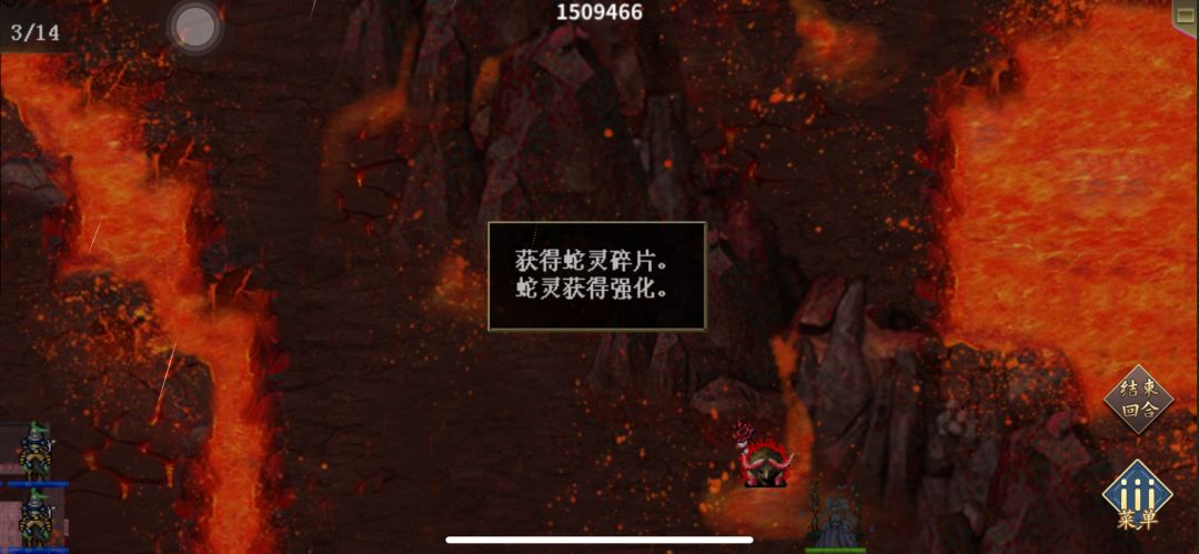 第二关开局往下走,第二回合初出现选项,回合结束时出现敌军,可以提前占好位卡住敌军位置,消灭完伏兵后蛇灵会一直向下移动,图3强化蛇灵,图4碎片位置