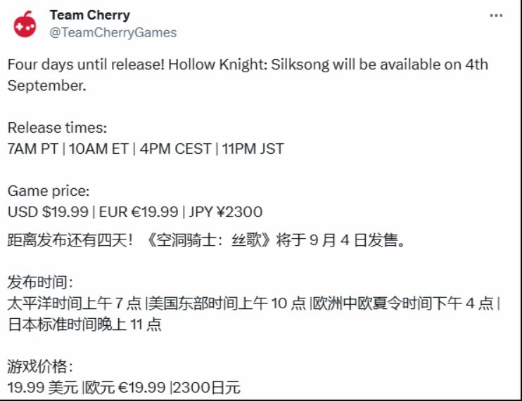 《空洞骑士:丝之歌》官宣:9月4号晚10点发售,售价19.99美元