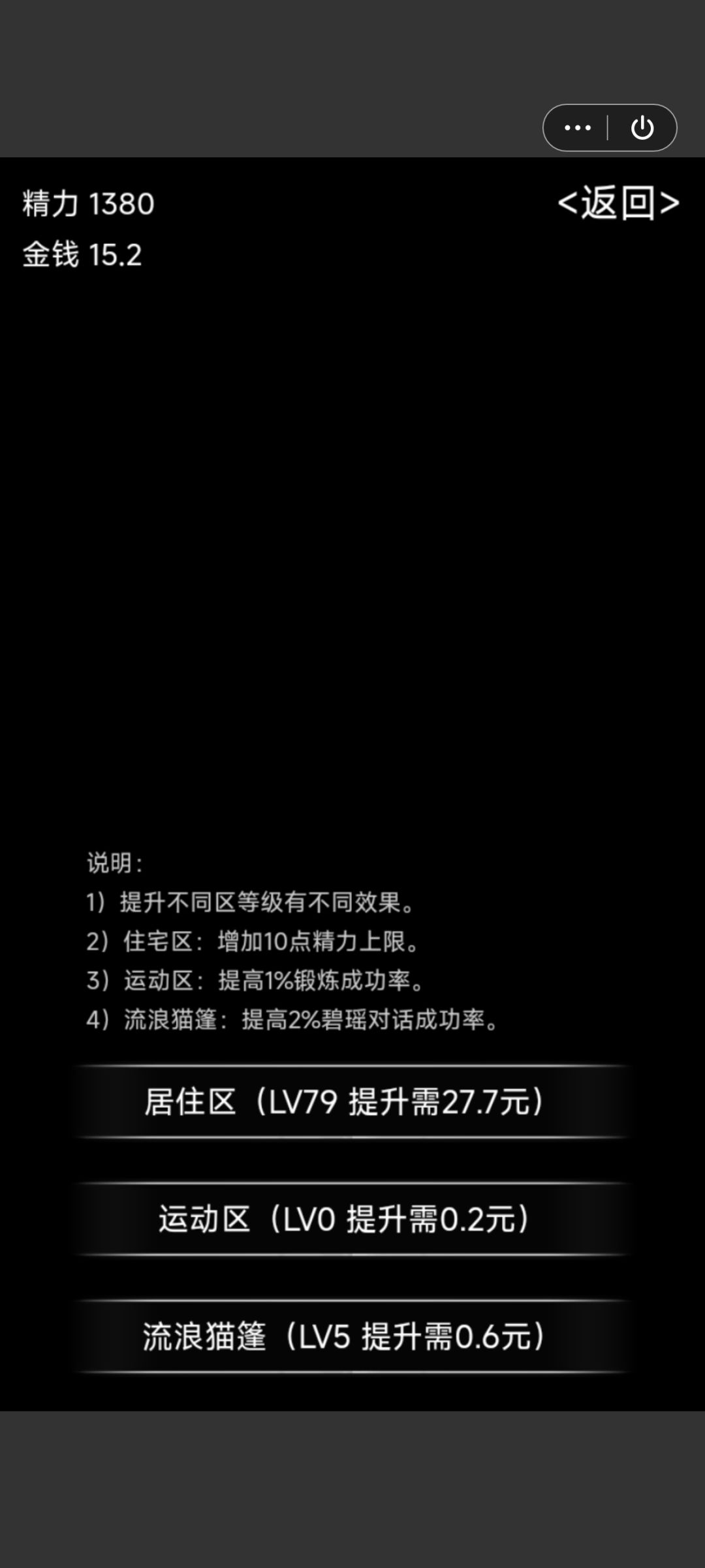市中心最重要的是晓风大楼,里面最重要的是戒烟选项(成功率随市中心开启后天数,每过一天降低百分之一,最初应该是75%)所以尽快进市中心开始循环,我是70%的开始,上一把因为进的晚了,百分之四五十的概率烟瘾太大,根本降不下来