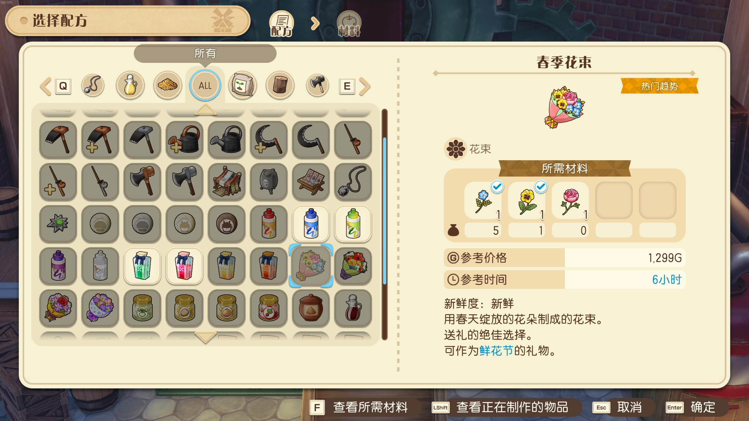 背包内所需材料齐全,一键开始制作,大多基础材料都可以通过风车进行二次加工成其他更高级的产品,材料礼品,道具食材,没有杂物只有产物,二加工的产物售价更高,也会涉及到任务物品的制作。