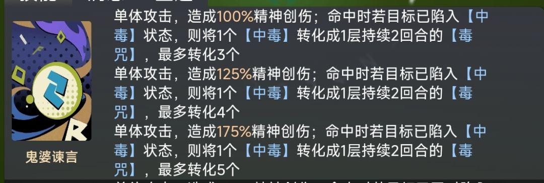 单体攻击。命中已中毒目标时,把「中毒」洗成「毒咒」,一阶最多洗 3 层。洗完后,毒咒在敌方回合结束时统一结算本源伤,层数越高越疼。