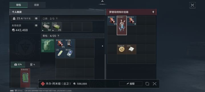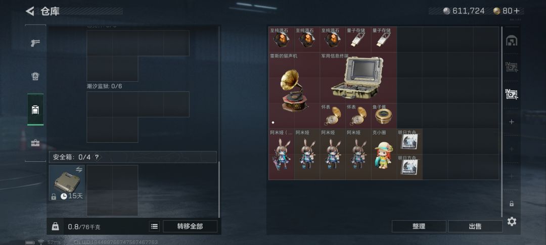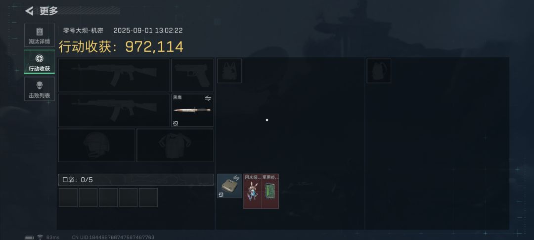 600万跑刀机密,只剩60万。刷了3个金兔,2颗原石,十几张光盘,几十堆碎片。一把大爆补偿局,一个剑兔一个终端一个留声机,撤离失败宝箱带走俩