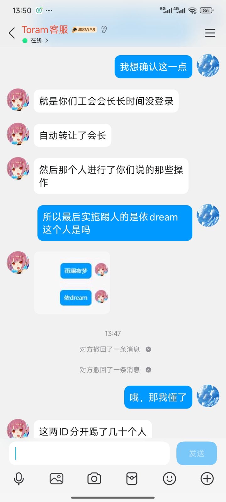 经过客服核实,我方公会遭窃事件的是由游戏id“雨澜夜梦”获取公会长权限后,与“依dream”一人踢几十个人完成的,同时我方还握有多项证据可以佐证,特此说明。我方要求其立即归还公会,说明事情缘由,赔礼道歉,并承诺不再做出此种行为。