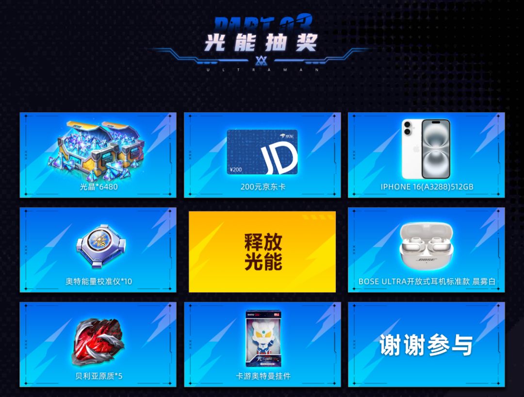就在今天,抽奖活动全服燃爆开启,火力全开!奥特英雄们紧跟战队步伐,为荣誉而战,iPhone 16、BOSE耳机等众多豪礼即将花落你家!