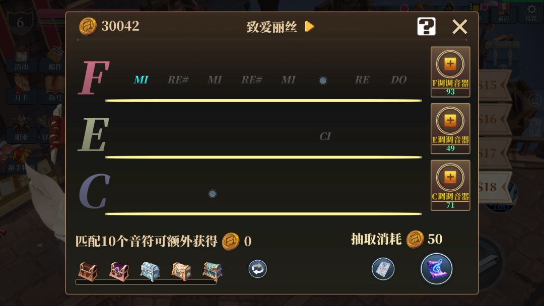 在赛季的全新玩法中,玩家需要消耗指定的门票道具即可开始一局游戏。在游戏开始后,界面会展示出一首曲子的音符排列,并高亮显示第一个音符。点击“音律”按钮,会消耗金币并随机抽取一个音符。如果随机出现的音符与当前高亮的音符相匹配,则视为成功。高亮框会自动移至下一个音符。需要注意的是,每次点击“音律”按钮消耗的金币数量将会逐渐增多。