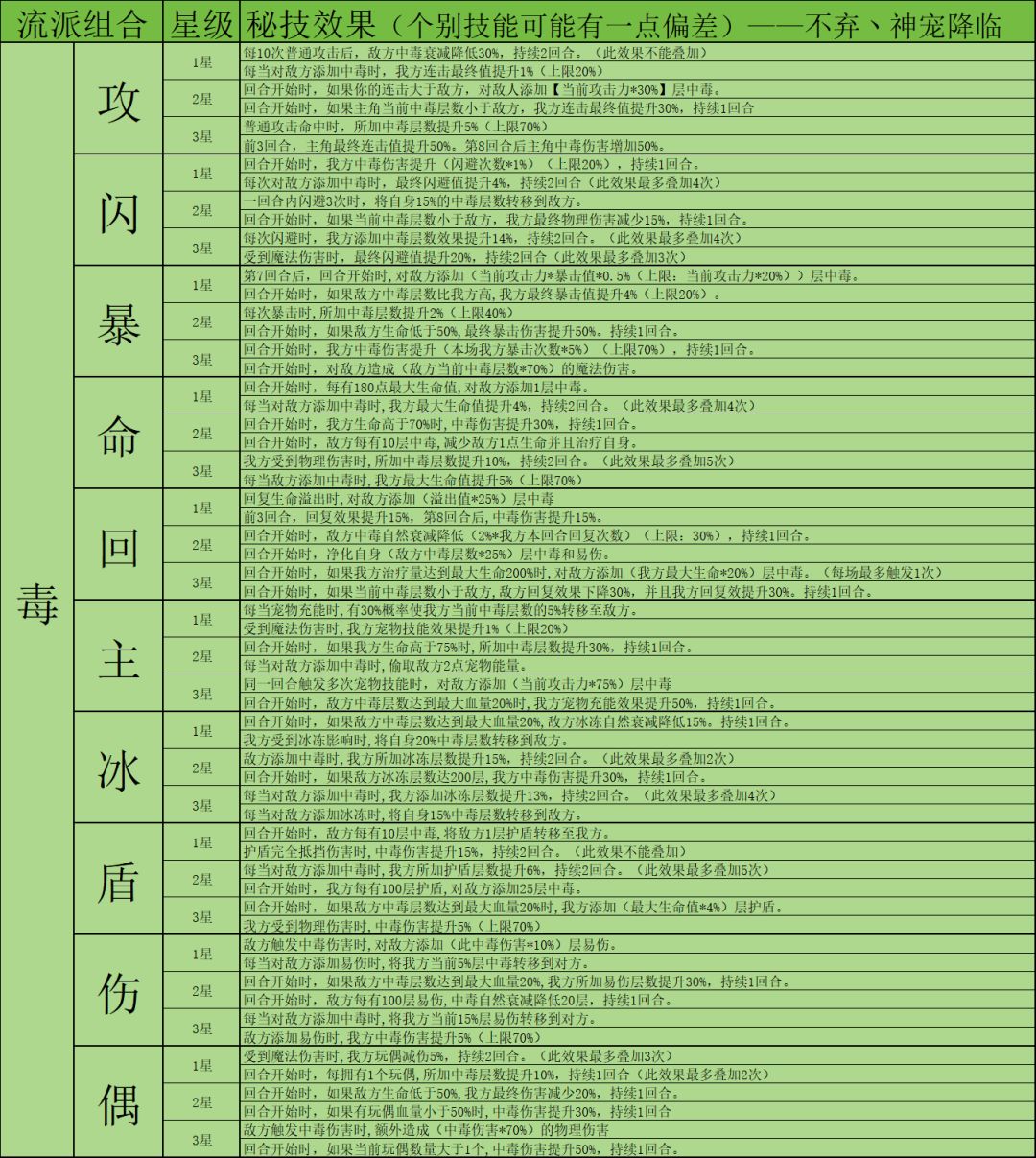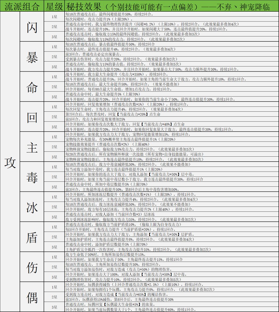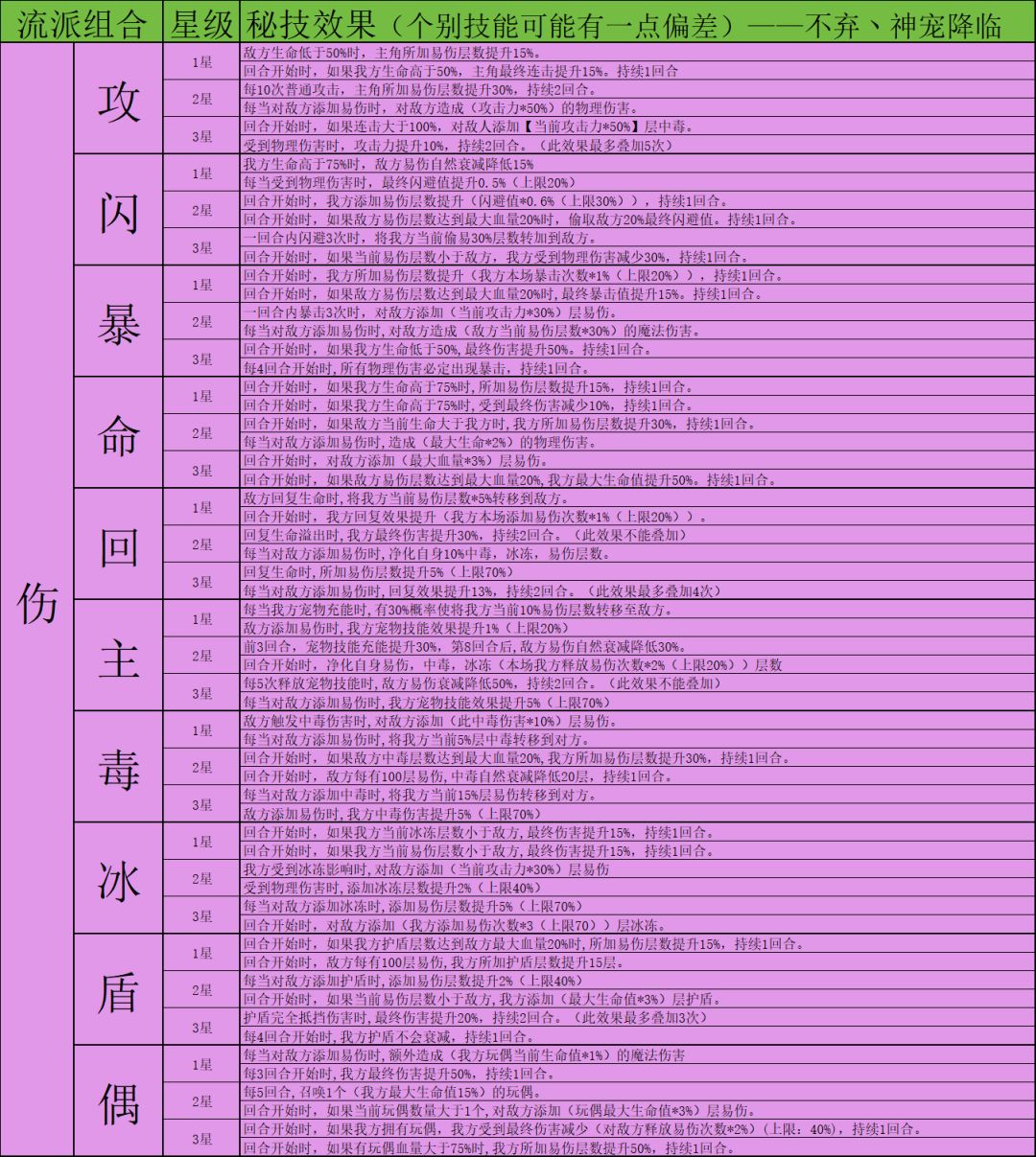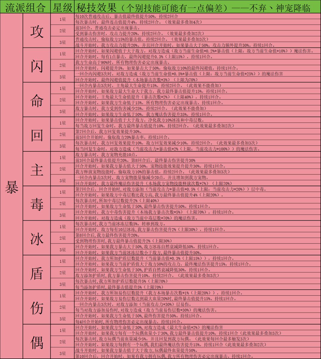 因为秘技数量非常多,下面会以表格图片的方式展示,大家有兴趣可以自行保存研究。这里就不一一介绍秘技了,后续构筑攻略如有使用对应秘技会着重介绍。有些个别秘技可能会有不准确的地方见谅,这边发现后会及时更改。