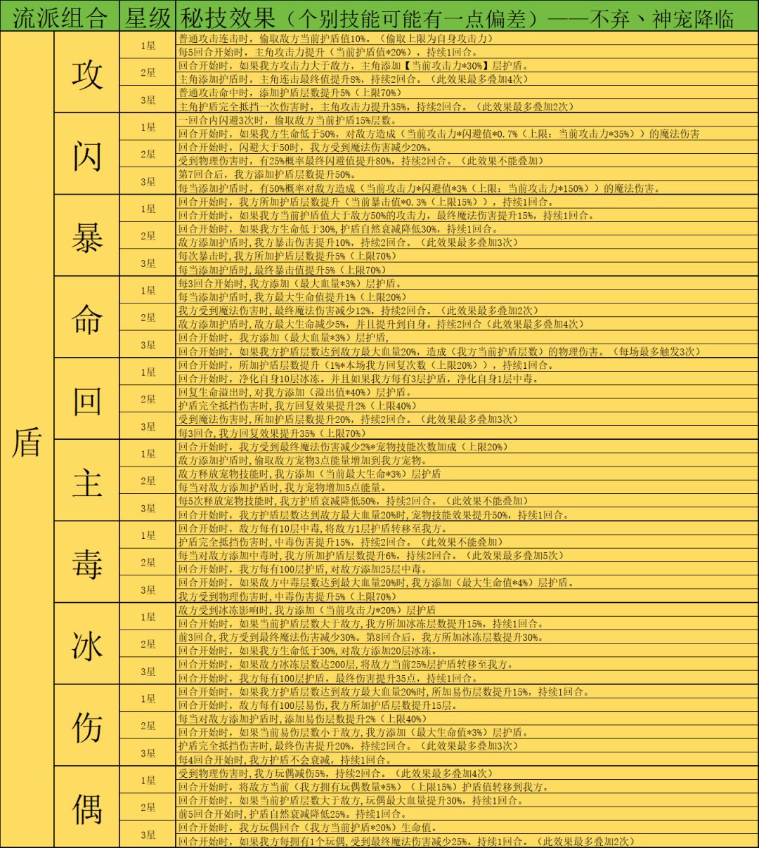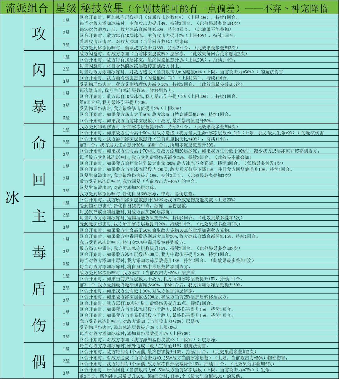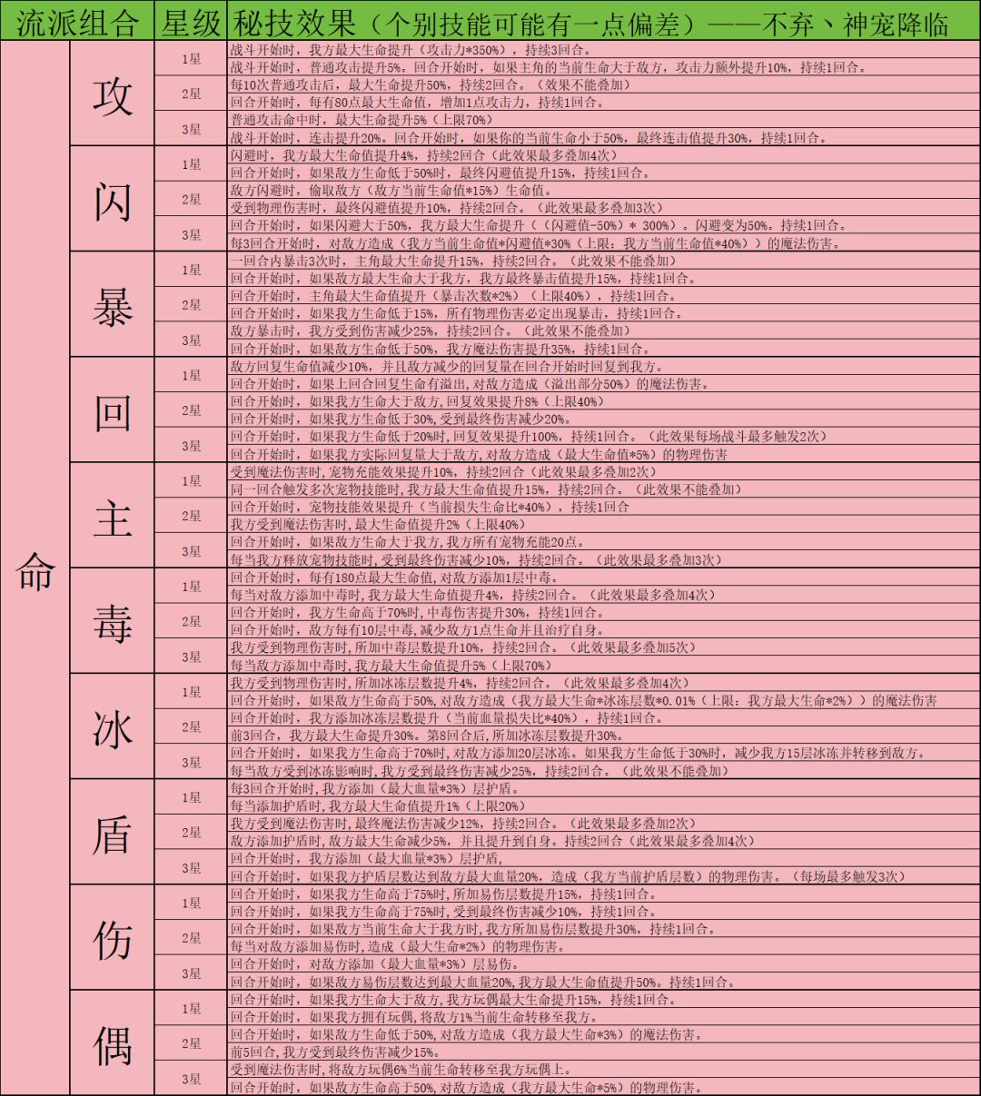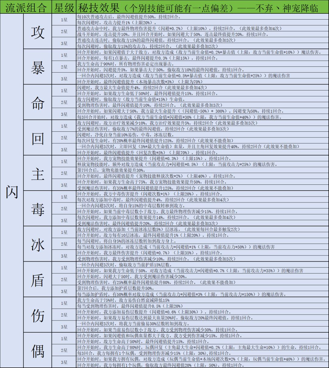 因为秘技数量非常多,下面会以表格图片的方式展示,大家有兴趣可以自行保存研究。这里就不一一介绍秘技了,后续构筑攻略如有使用对应秘技会着重介绍。有些个别秘技可能会有不准确的地方见谅,这边发现后会及时更改。