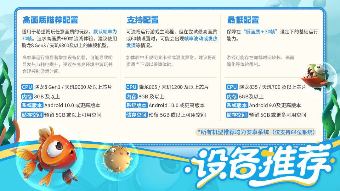 A:为了让各位小伙伴在《我是小鱼儿》中能够获得良好的游戏体验,针对不同画质与帧率表现,我们专门整理了相关游玩设备推荐所推荐的设备配置建议,请看↓↓↓!