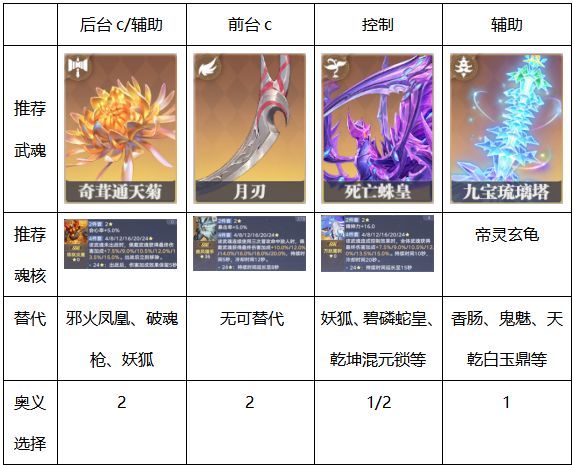 阵容打法:奇绒通天菊只需要后台叠孤芳自赏即可;死亡魔珠根据打图选择奥义,打小怪清杂用第一奥义聚怪,打boss和长期战斗选第二奥义叠增伤和控制;月刃先放奥义叠月影,在月影叠满后的连招顺序为:魂技→普攻→奥义→普攻→魂技→普攻→魂技→普攻。辅助提供增伤和魂力。