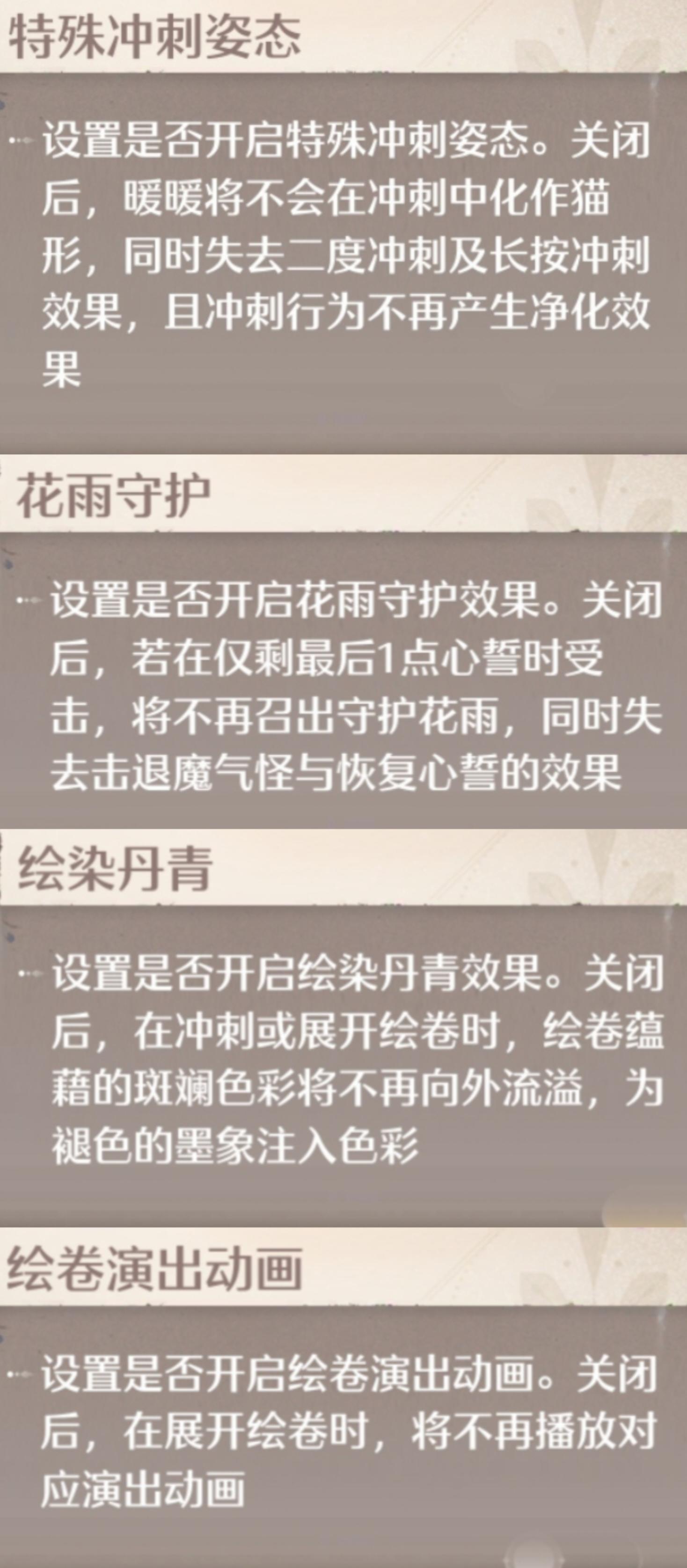 2. 猫套我不想要绘卷置景挡到视线了,🐈满进一圈大雁特效能不能关了明明八音盒就可以啊,冲刺我只想要点按,不想要长按的那个能力,怎么偷懒啊,这些能不能单独出个按钮啊啊啊啊(▰˘︹˘▰)?