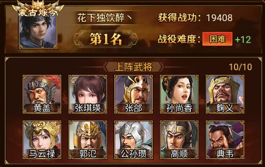 成功荣登本期下邳之战榜首的是 花下独饮醉丶 军团,以 19408 的优异战功位居第一,突破战役困难12,恭喜!