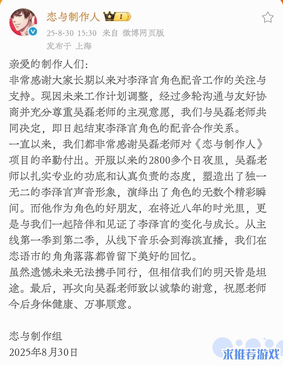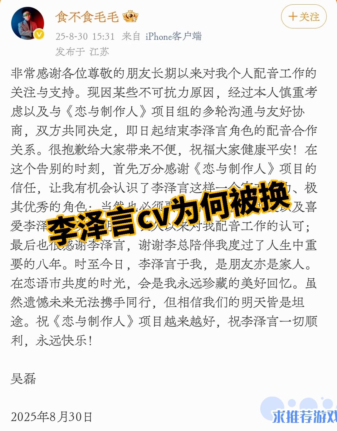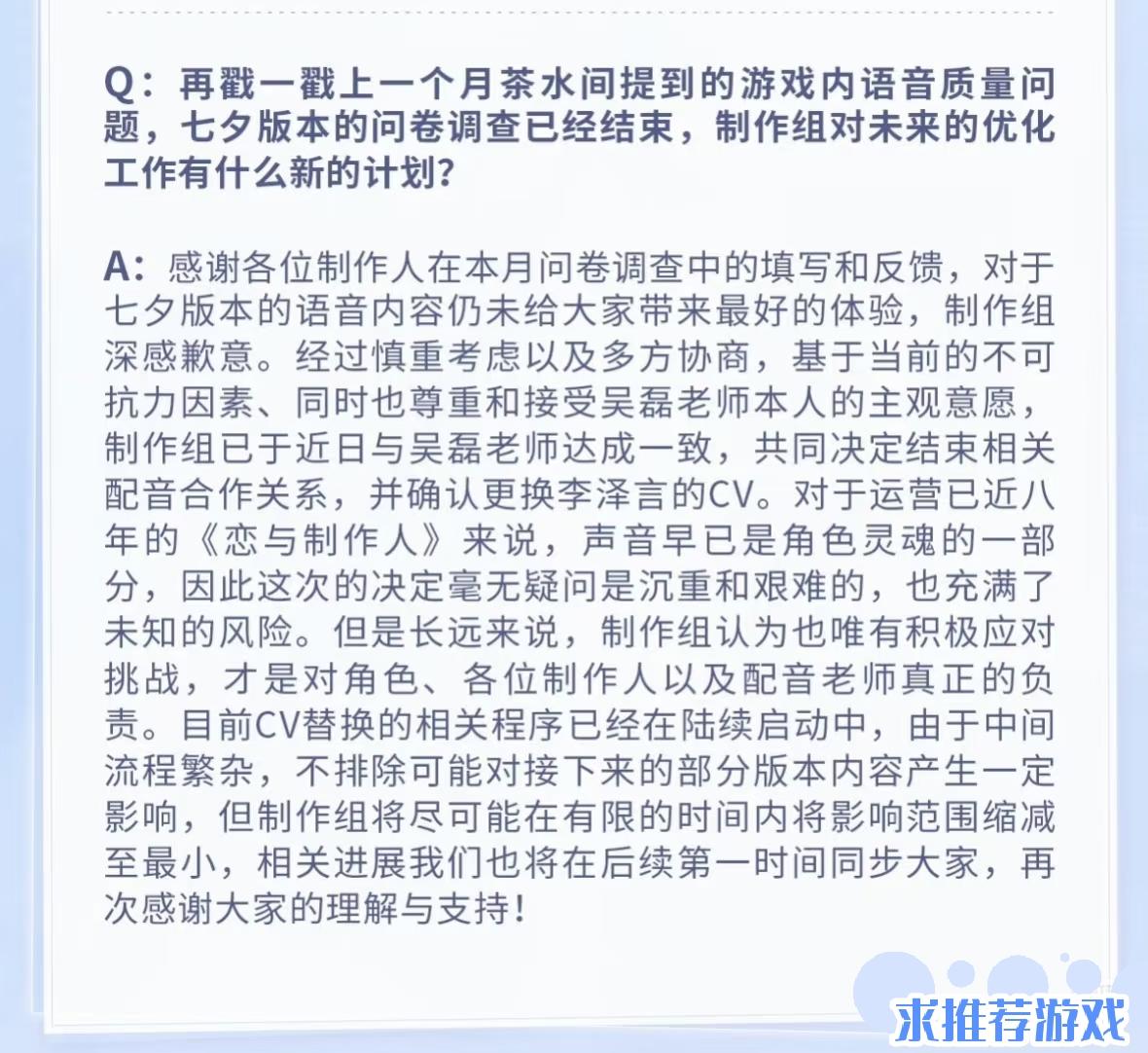 虽然早期配音老师确实配的很好,部分玩家表示疫情后嗓子出问题,乙游一直配不回原来的感觉,但是网友发现他配别的东西都在状态,最近这段时间觉得声音里的情绪也不太对。网友希望换cv,最后恋与制作人协商后发表公告。
