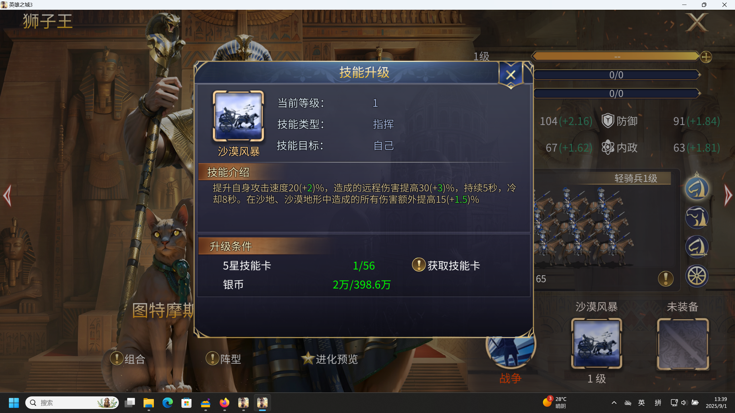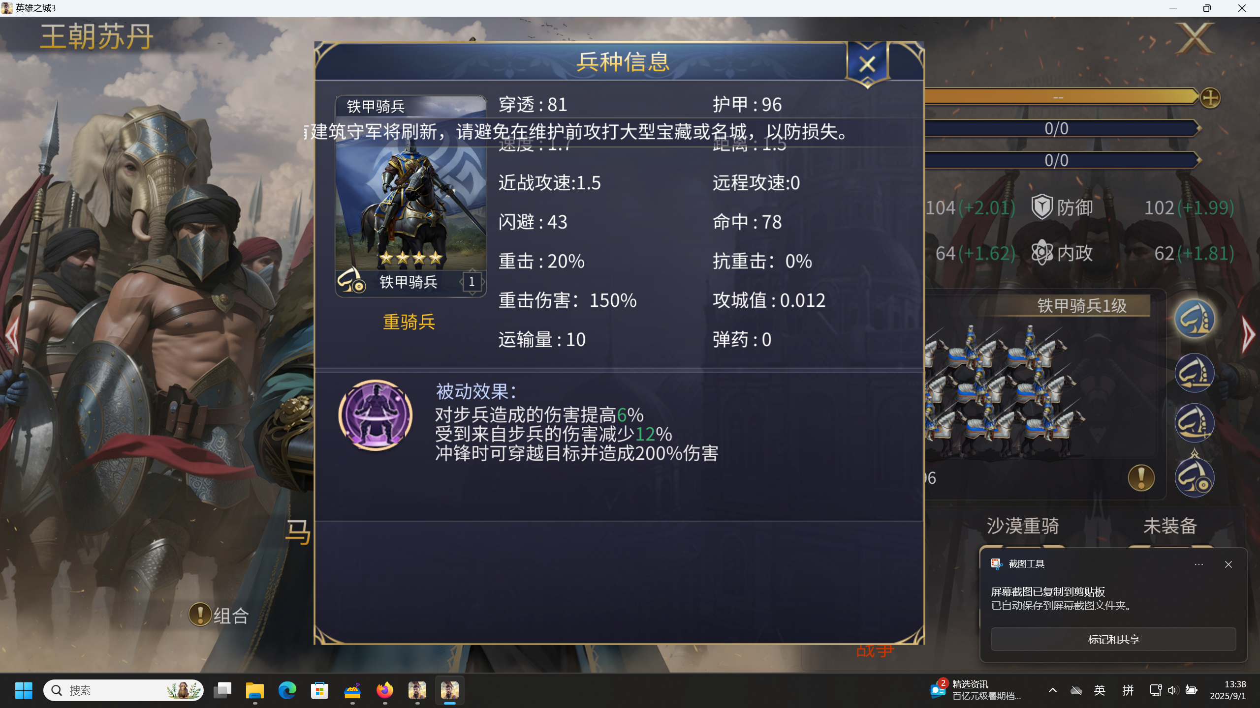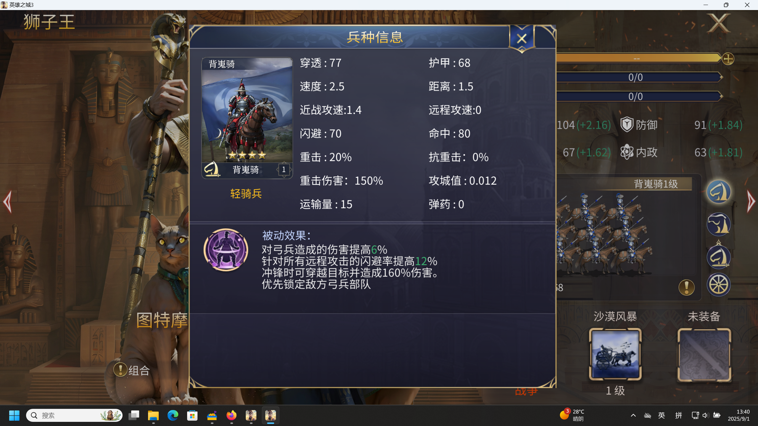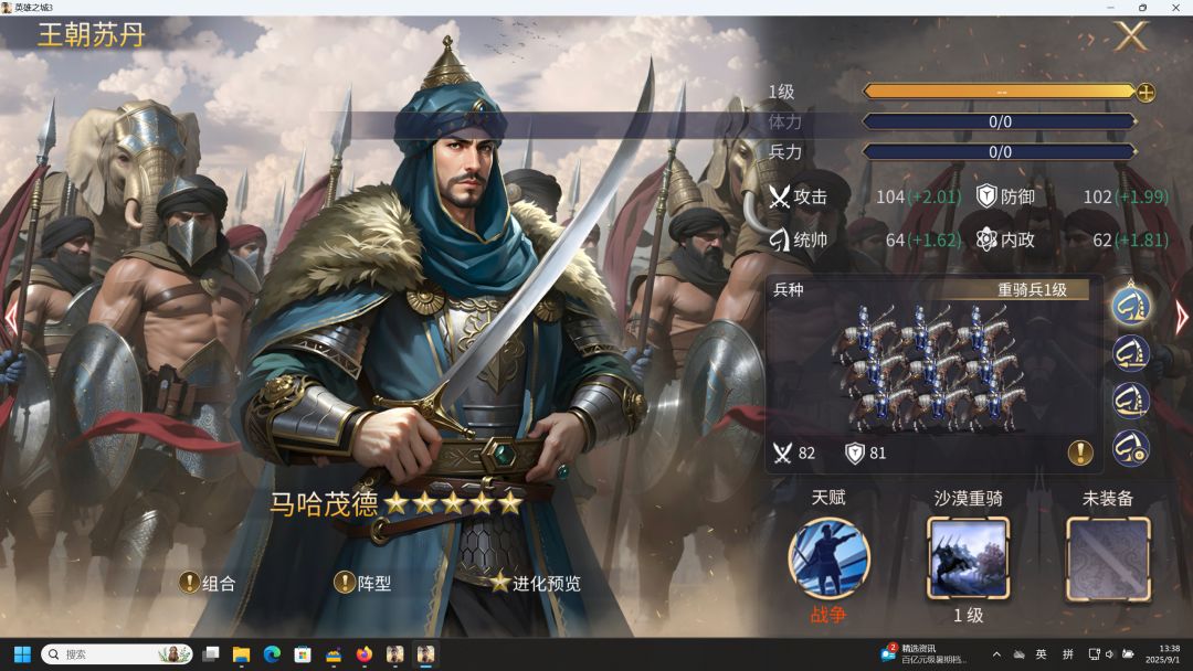防御102(+1.99),对比新的骑兵英雄,比高丽太祖100(+2.01)少了两个基础点,比狮子王91(+1.84)高11个基础点,比大司马105(+1.86)少了三个基础点。和老五星英雄比,比万王101(+2.02)高了一个基础点,比岳飞90(+1.76)高了11个基础点。可以看出,从防御属性来看,王朝苏丹的属性很优秀,是标准的攻守均衡的重骑将领属性。