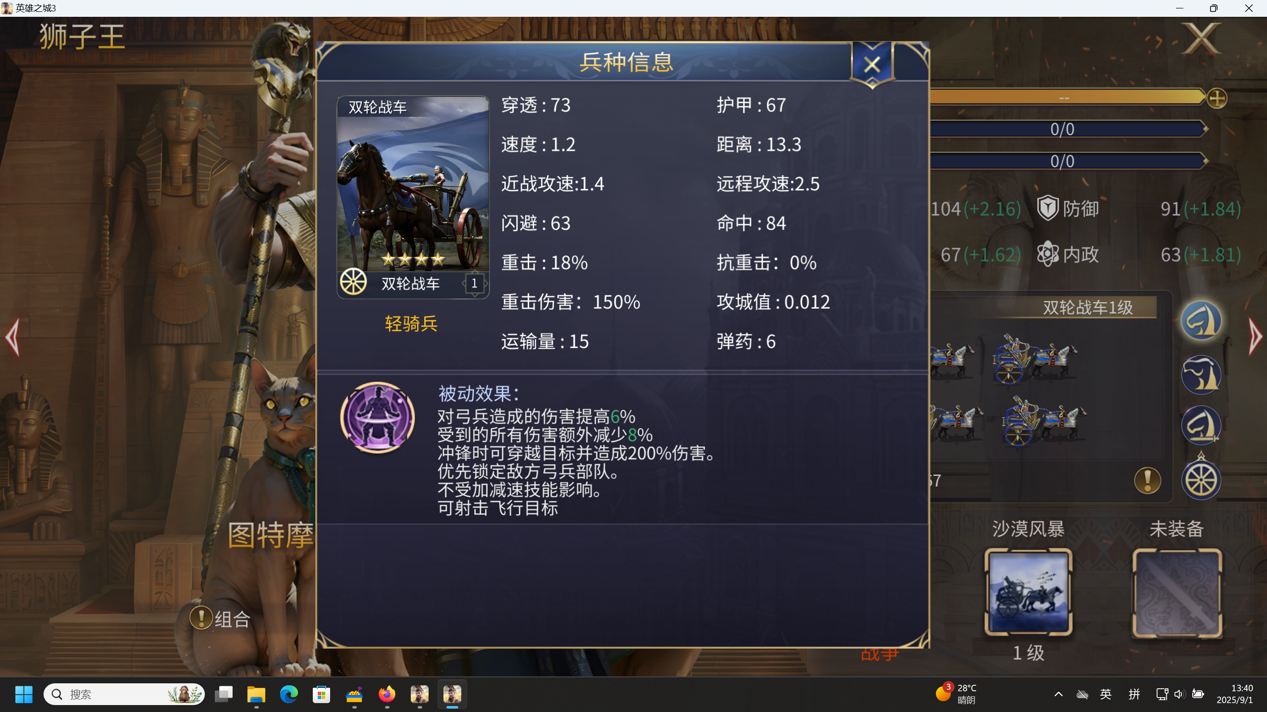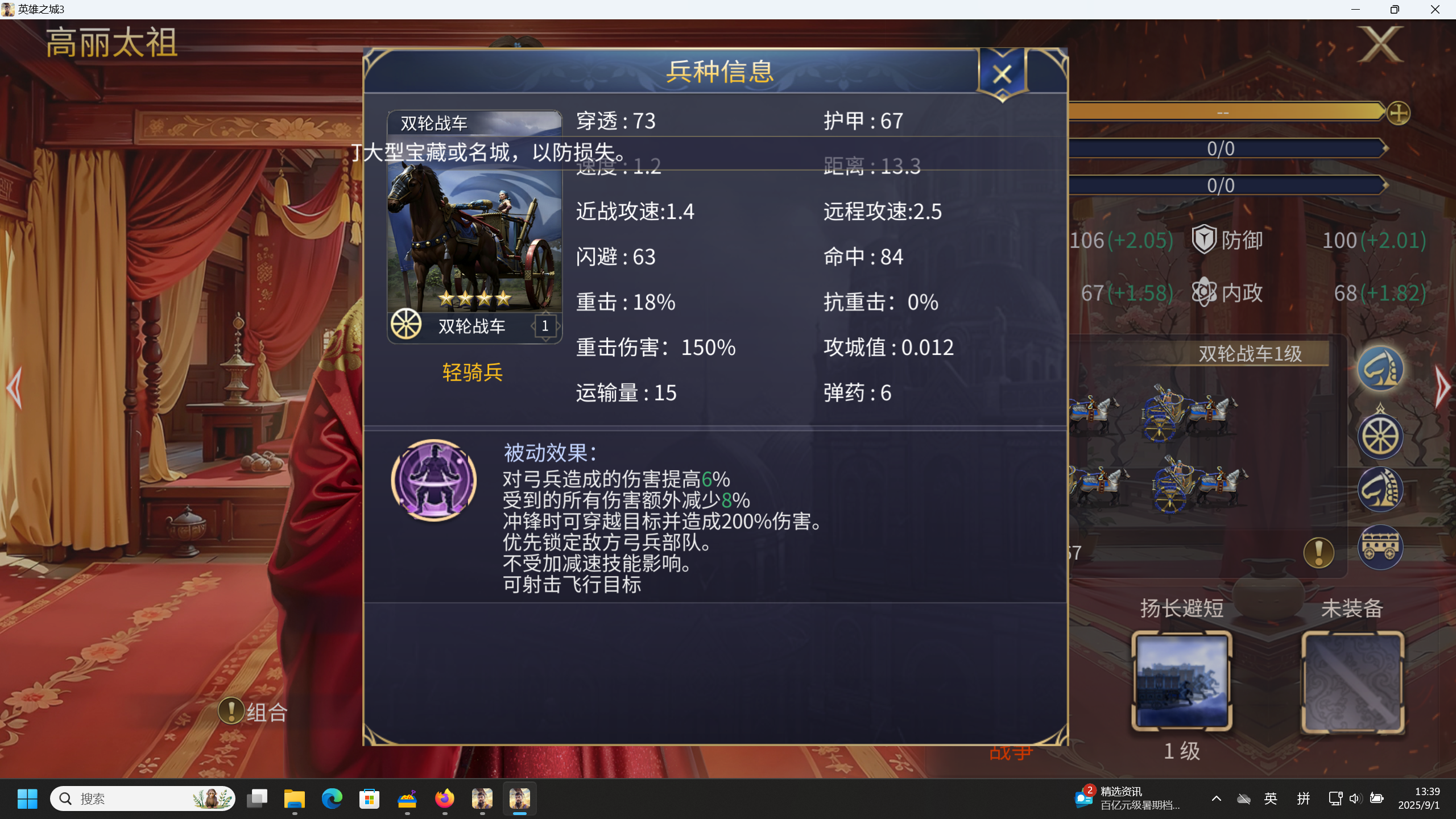 双轮战车是轻骑兵,除了轻骑兵都有的锁定弓兵特性外,它还有额外的减伤特性。另外它还拥有六发弹药,是轻骑兵中最吃香的远程轻骑兵。纸面数据看着都很好,但实战中,双轮战车部队的ai有问题,总是冲到敌人面前才攻击,这就完全抛弃了它最大的优势,远程。所以,如果有更好的选择,不推荐双轮战车。