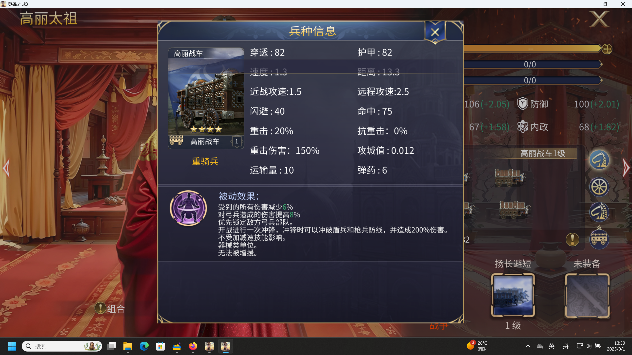 2“8秒后,自身造成的远程伤害提高25(+2.5)”,高丽太祖技能的减伤,保证了其生存能力,这样在8秒后能维持相对完整的部队编制,需要注意的是,技能效果是远程伤害提高,那么我们在为其选择兵种时就不应选择近战的骑兵了,技能升满有47.5%的加伤,也是相当不俗的数值了