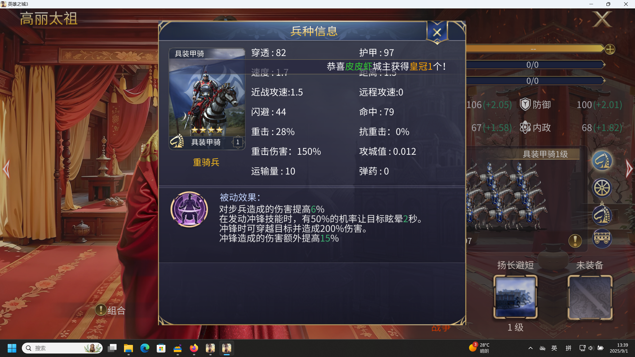造成的所有伤害提高8%,输出性的骑兵,特性还可以。