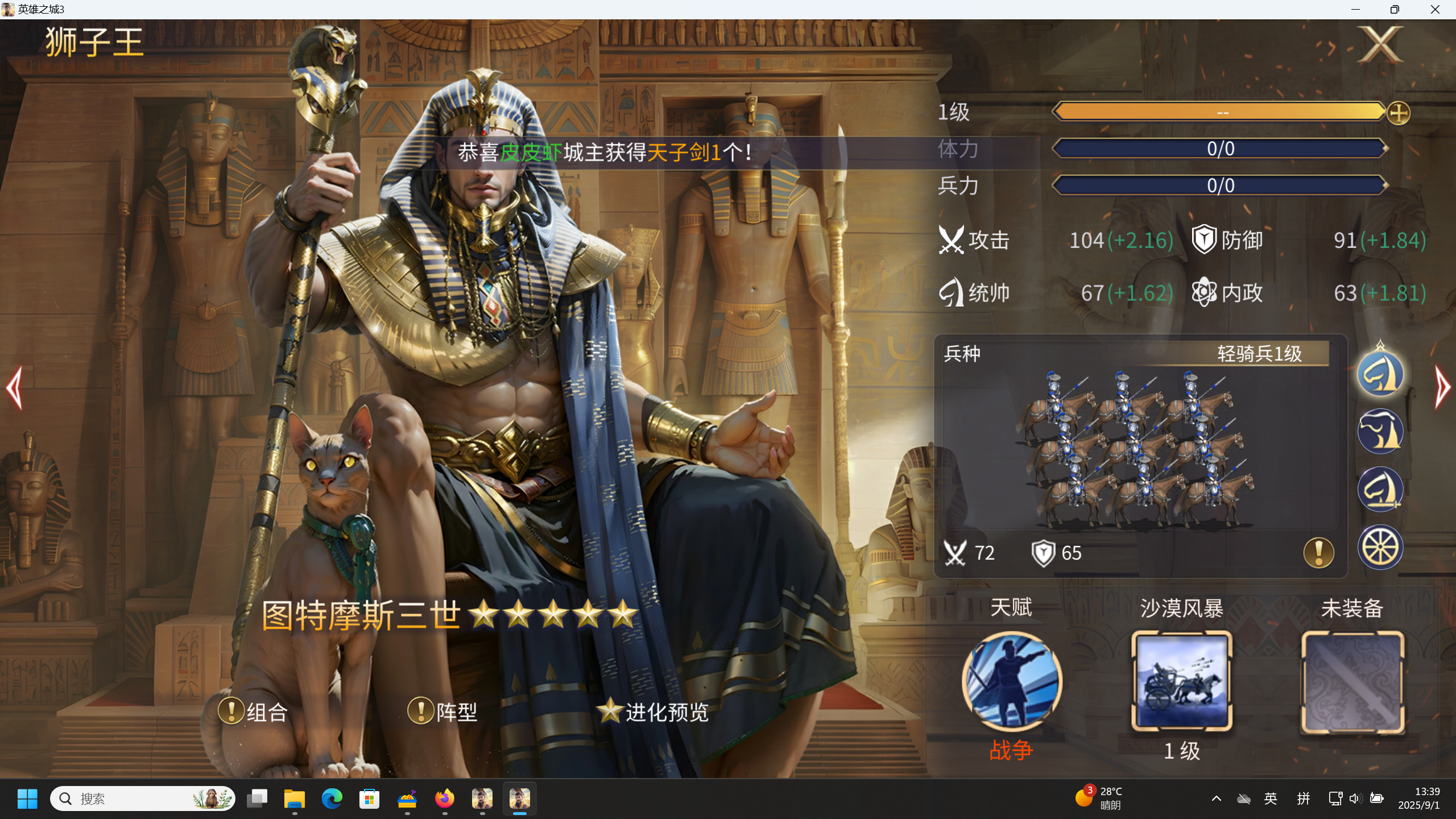 统帅67(+1.62)),对比新的骑兵英雄,比王朝苏丹64(+1.62)高了三个基础点,比高丽太祖67(+1.58)持平,比大司马73(+1.81)少了六个基础点。和老五星英雄比,比万王72(+1.43)少了五个基础点,比岳飞78(+1.72)少了11个基础点。统帅意味着带兵量,而带兵量间接反映了英雄的输出和防御能力,这个数据,狮子王比较拉跨。
