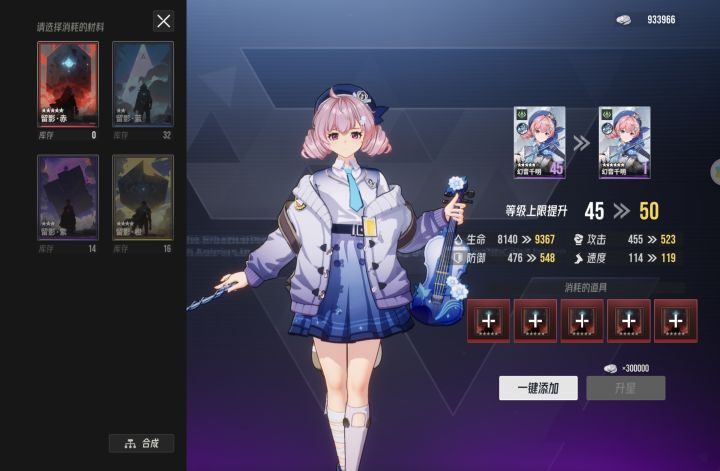 1.异格者的等级与星级:最高为六星,ssr初始为4星,sr为3星,r为两星。升级需要消耗“调查记录”,升级会提升角色的基础属性(攻击,防御,生命)。每当升到某颗星满级变需要消耗“留影”升星,升星会提升角色的攻击,防御,生命和速度(很重要)。“留影”分为蓝,紫,橙,赤四种,高阶的可由低阶的合成。“留影”在前期是很重要的资源,目前在游戏中除了任务的奖励,商店换取之外,没有其他稳定的获取方法(指没有专门刷留影的副本,刷调查记录的副本可以掉落蓝色留影但是效率非常的低)。
