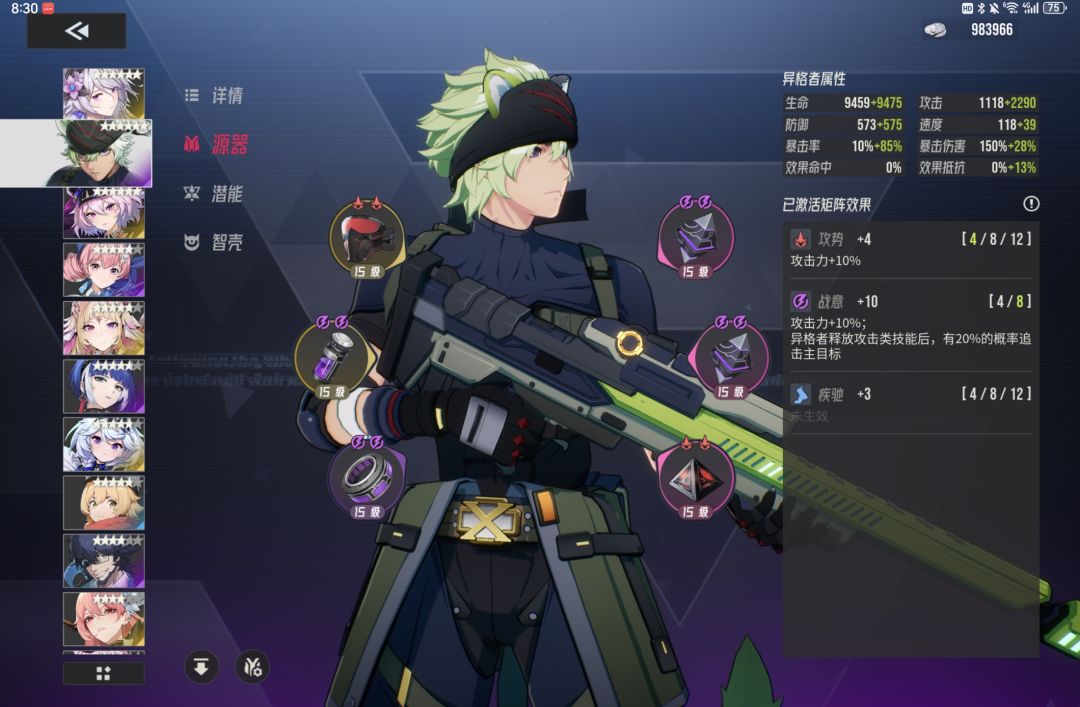 异格者们的属性面板为生命,攻击,防御,速度,暴击率,暴击伤害,效果命中,效果抵抗。其中升级只能提升生命,攻击,防御。升星则是可以提升生命,攻击,防御和速度。那么其他属性的提升就需要用到源器和智壳啦。