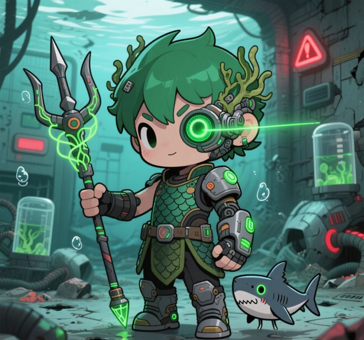 赛博朋克元素植入:以“机械替代自然”为核心——传统鱼鳞换为拼接式金属鳞甲,边缘嵌蓝紫霓虹光带;三叉戟改为“碳纤维+电路纹路”结构,尖端设发光能量口;头顶加半透明科技感头冠,内置流动光效模拟“海浪”。