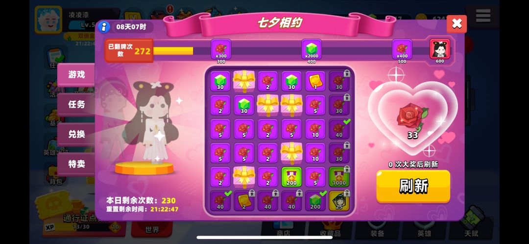 我272发出的2000玫瑰换的一星白蛇,活动开始后第二天我才解锁活动,大概也花了有2w钻,不过这游戏挺良心的了,送的钻石也够多。