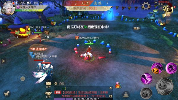 【愤怒的南瓜】南光灯作为万圣节的标志物,但是南瓜从何而来?蜀门弟子们决定来一次南瓜的争夺赛,于是一场争夺惊心动魄的南瓜蹴鞠大赛就此拉开帷幕。蜀友们可以在活动期间内进入“愤怒的南瓜”活动,召集40级以上的好友组队匹配或单人匹配进入游戏。