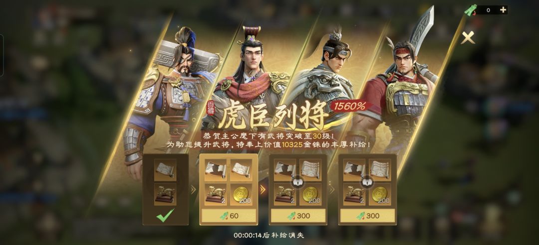 然后氪佬卡星的话也非常容易,如果大卡池抽的大百将录(一叠)不够的话,超值补给傲世群雄这里可以购买,基本每个武将只需要8张大百将录就能卡4星了,两个就16张,多了到后期等级够了,不用卡星了,作用也不大。