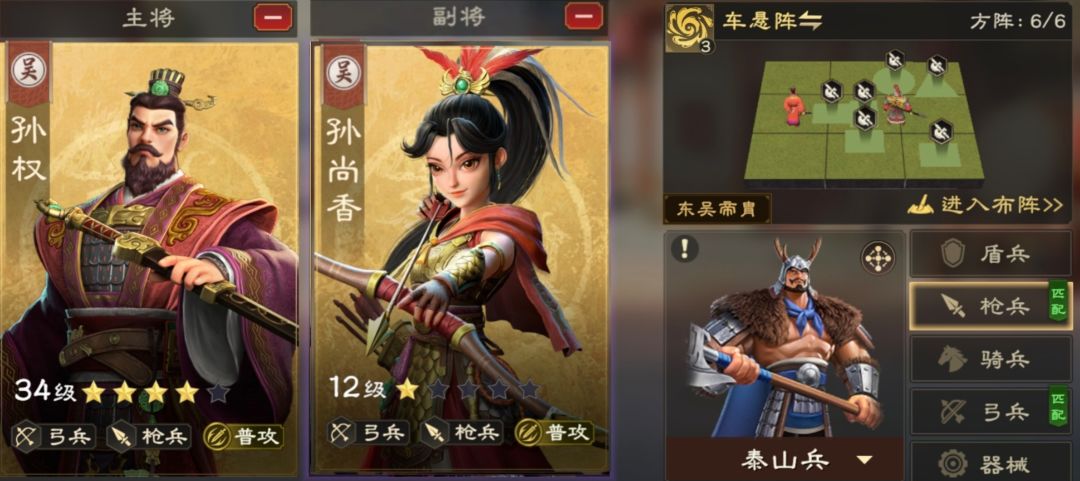 中氪党推荐孙权加孙策,搭配车悬阵和泰山兵,这个队伍对于中氪党来说还是比较容易组成的,可能就车悬阵比较难出一点,或者四皇之一的孙权容易歪,不过这些对于中氪党都不是问题,可以通后购买各种礼包来弥补。而且队伍一橙一紫的搭配,紫将孙策培养成本基本可以忽略不计,运气好前中期基本就能觉醒。所以就只需把资源都给孙权就行,无论是卡星还技能升级,资源都比较的充足。然后到中后期孙尚香能觉醒的话,就直接换孙尚香,这队强度更高。