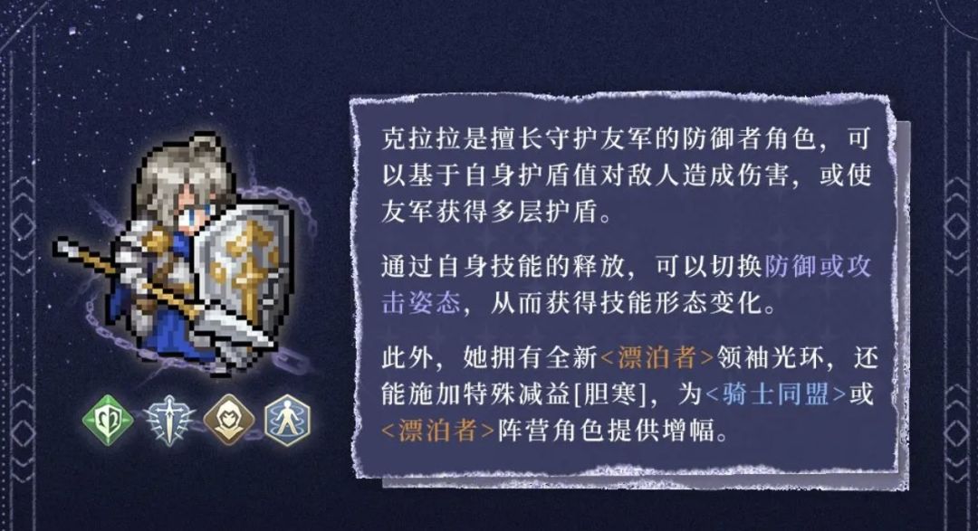 身着重甲的骑士少女,天性善良乐观、活泼大条。尽管被 "满满安全感" 的盔甲严密包裹,战场上的她仍难掩胆怯。时刻以 "骑士奋勇当先" 作为口号自我鼓励,更将圣骑士歌洛莉亚视为崇拜目标,梦想着有朝一日能成为真正保护他人的勇敢骑士。