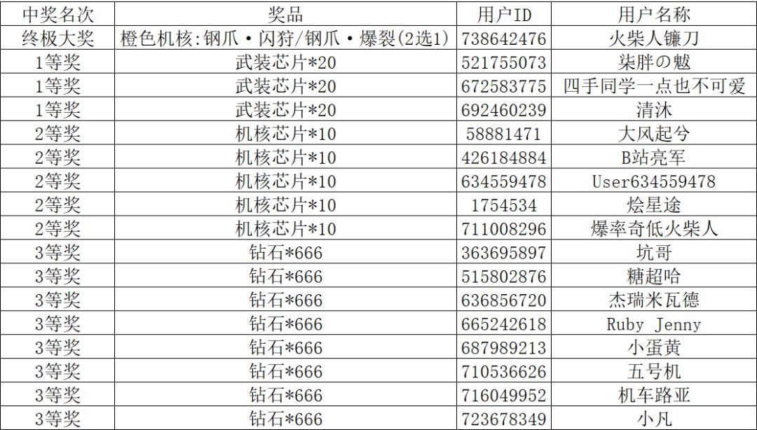 1等奖:3名:武装芯片*20